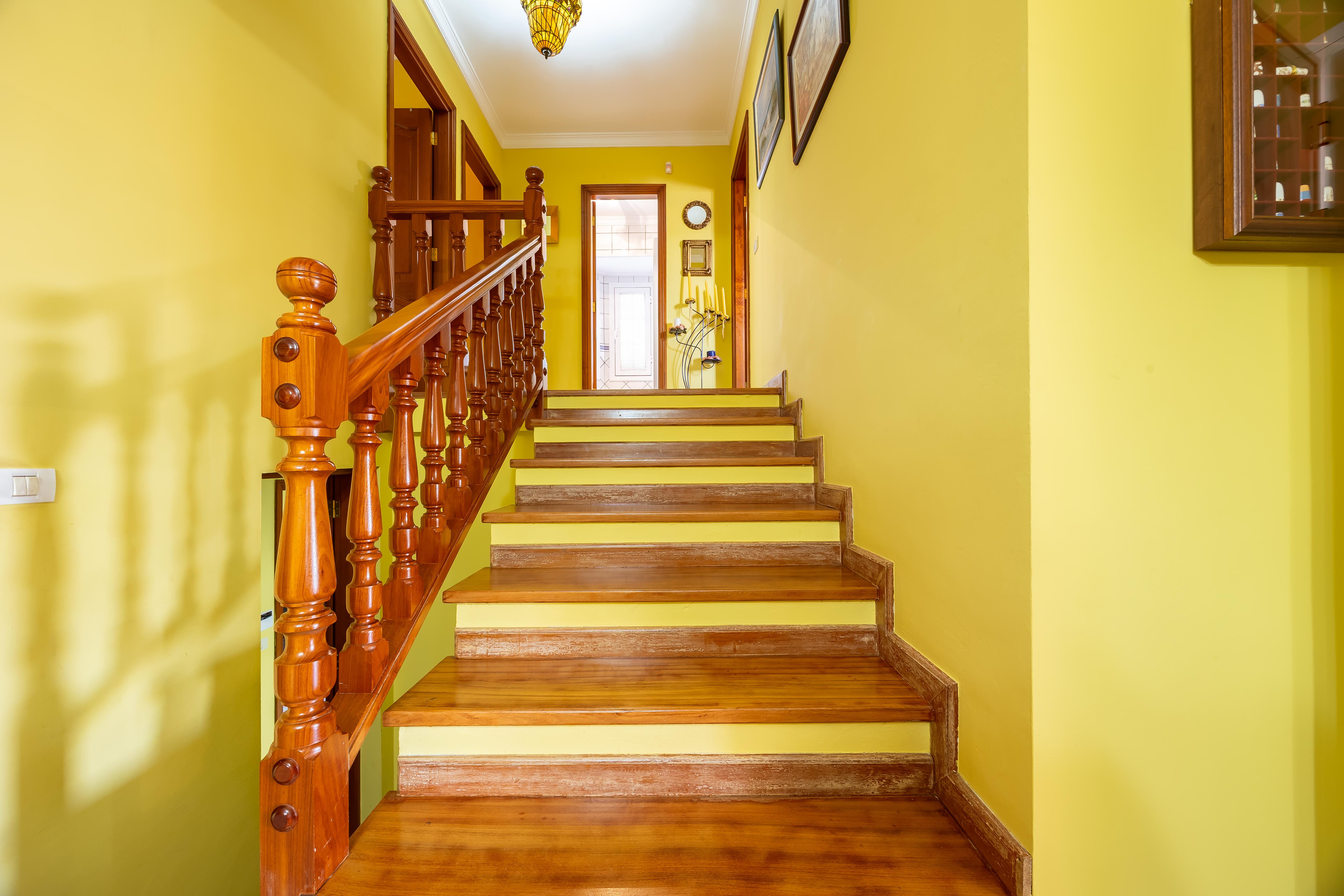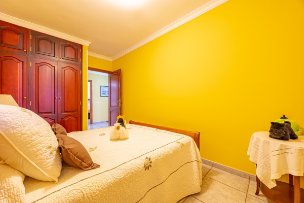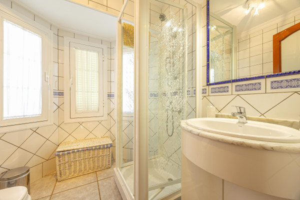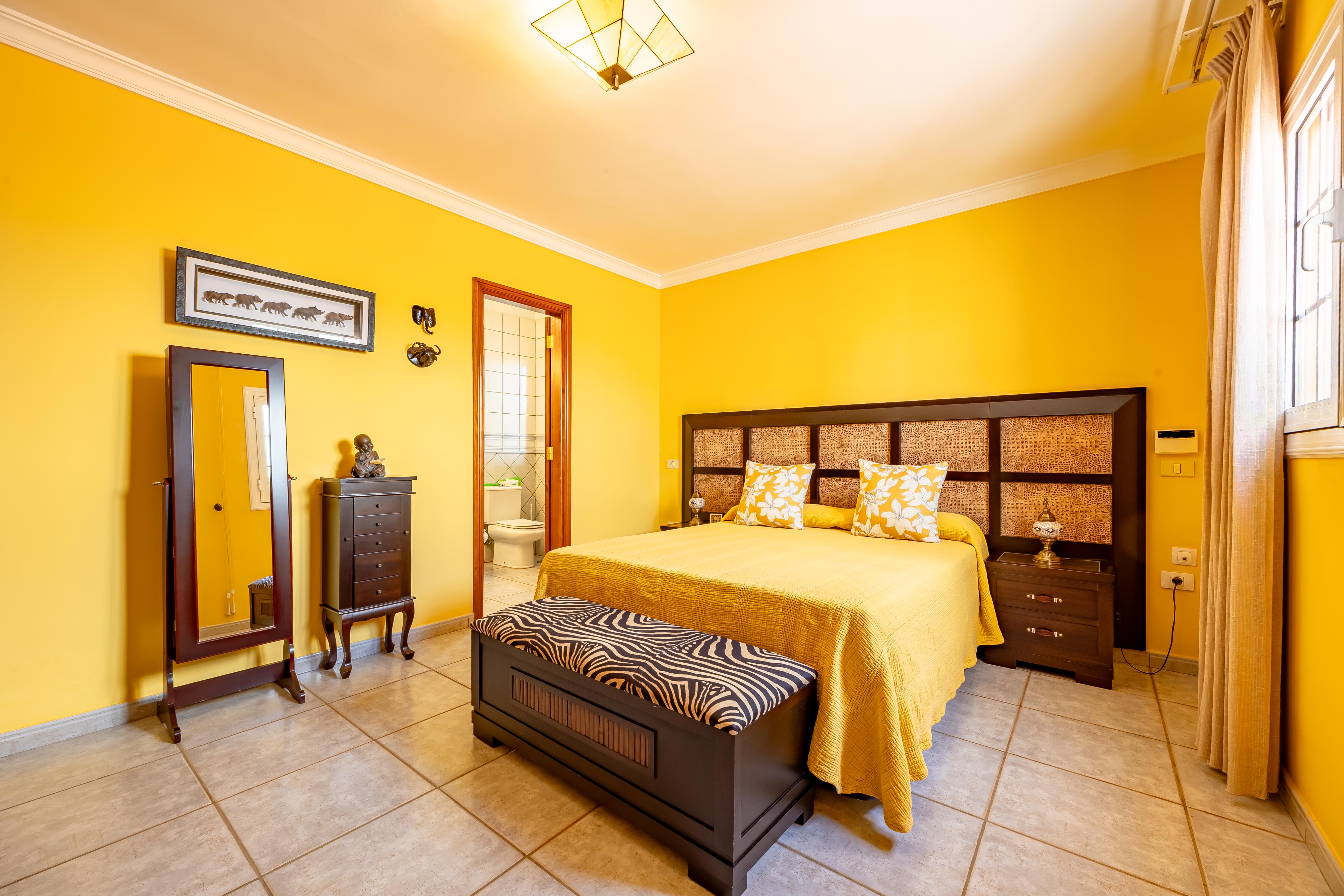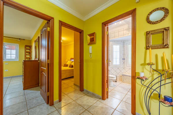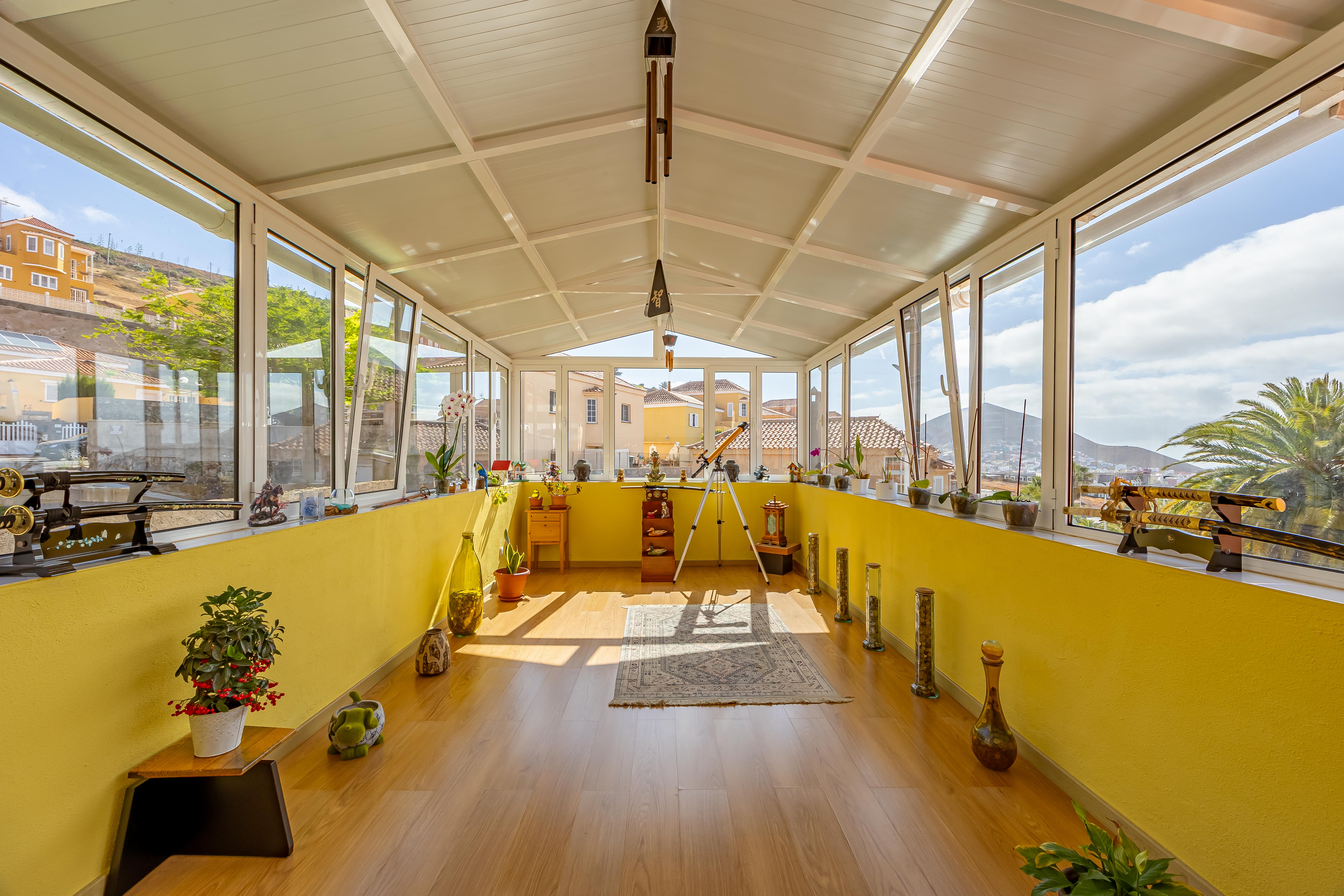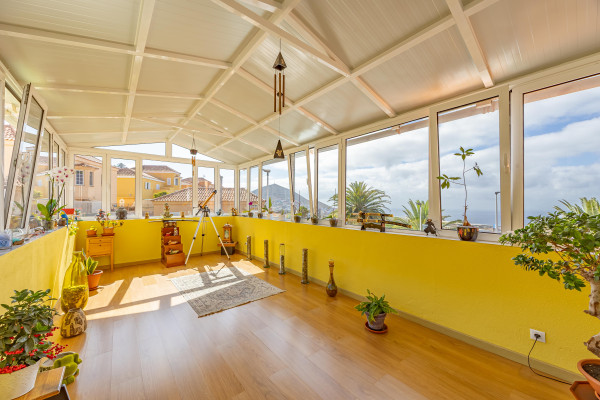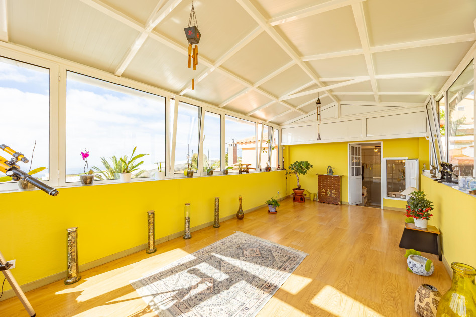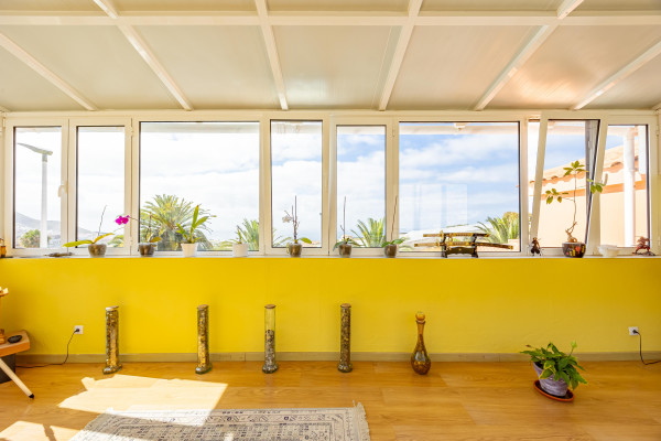 En la planta alta se ubican tres dormitorios dobles y dos baños. El dormitorio principal cuenta con baño propio y acceso a un impresionante espacio acristalado con vistas al mar y a la montaña; un lugar perfecto para desconectar, leer, hacer yoga o simplemente dejar que entre la luz.