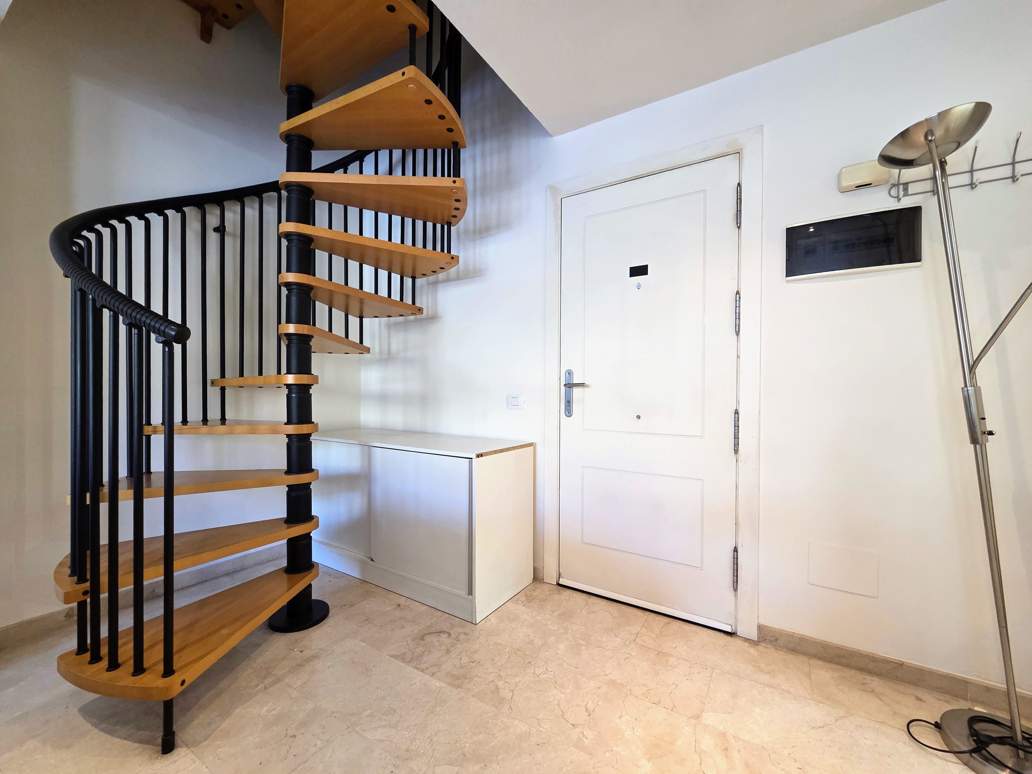 Escalera de caracol interior que comunica ambas plantas con estilo y elegancia.