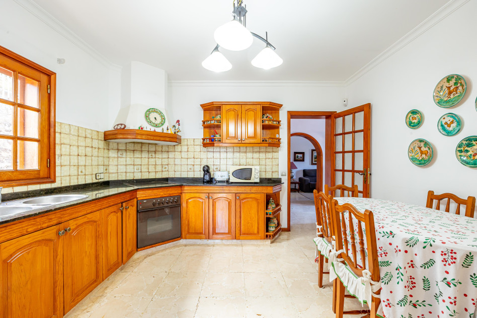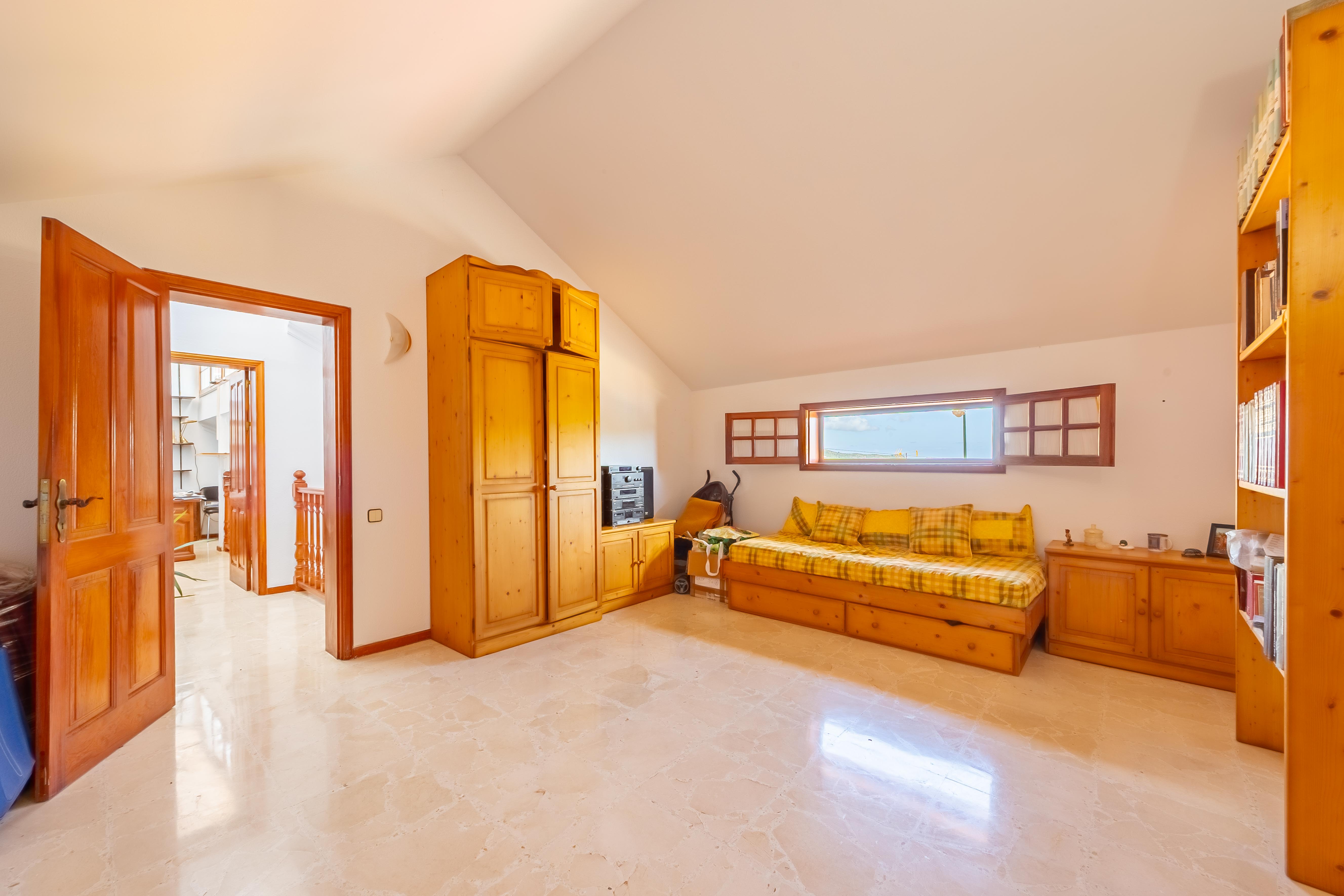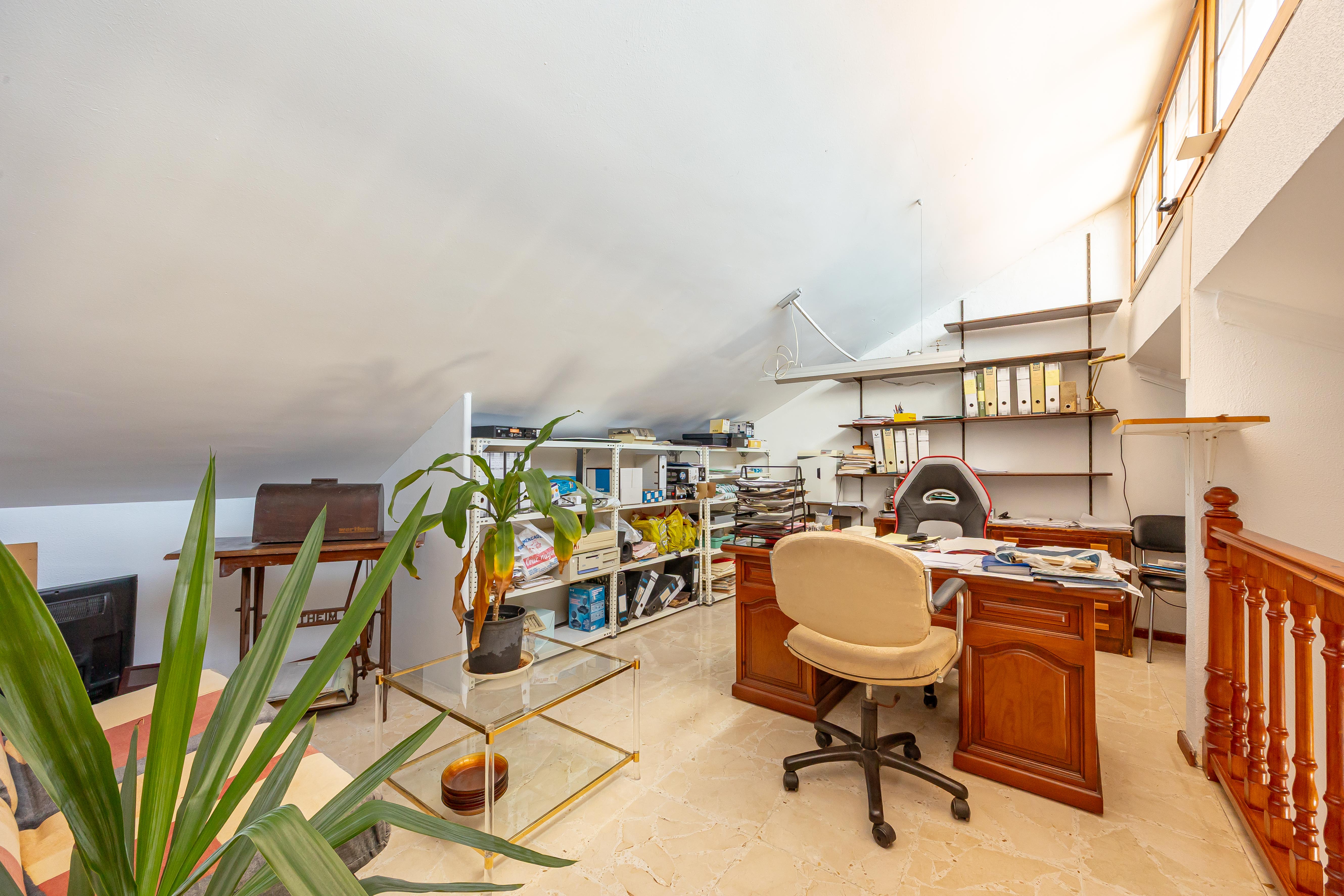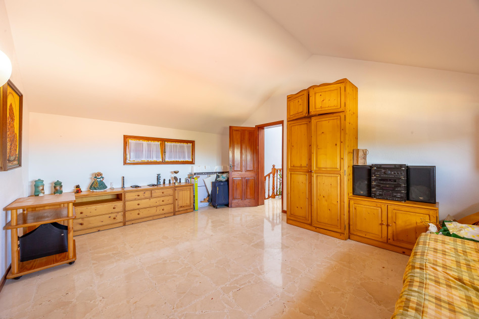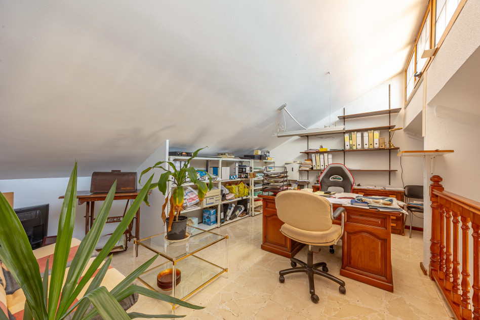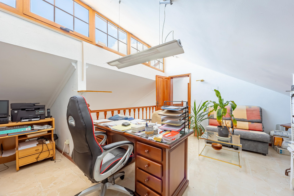 La vivienda principal, con 310,58 m² construidos, ofrece una distribución amplia y funcional: planta principal con diferentes ambientes exteriores, acceso a garaje y zonas auxiliares; planta superior con 3 dormitorios, dos baños (uno en suite), salón, zona de estar, cocina independiente, despensa, solana y gran terraza; y planta bajo cubierta con dos buhardillas y trastero, actualmente destinadas a sala de estar y despacho, con posibilidad de nuevos usos.