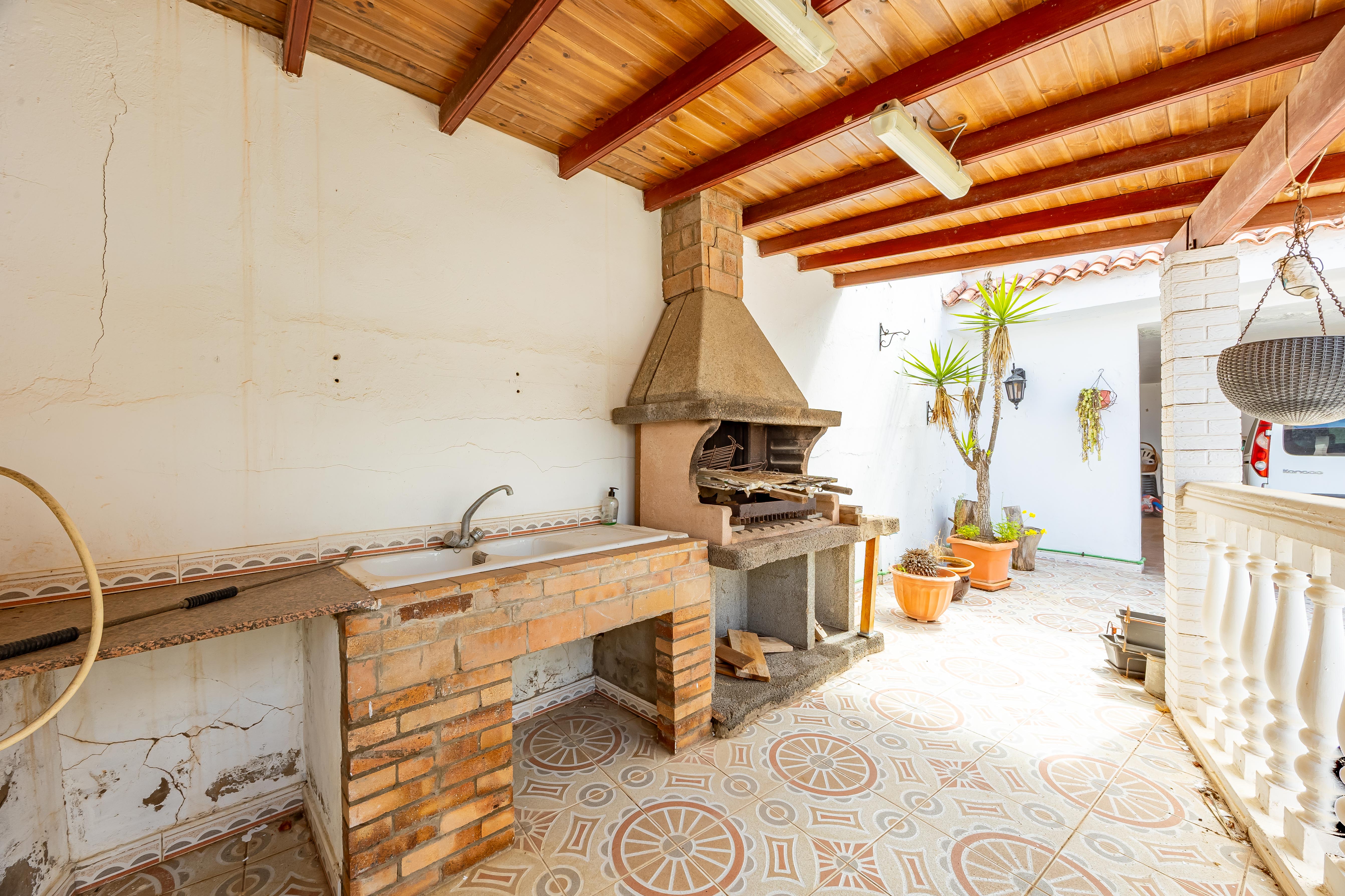 En el exterior encontramos zona de recreo con barbacoa, garaje cubierto para dos vehículos, cuarto de bombas con aljibe, aseo exterior y trastero.
