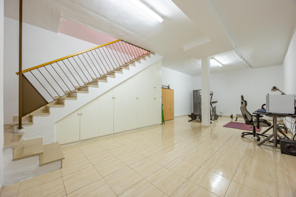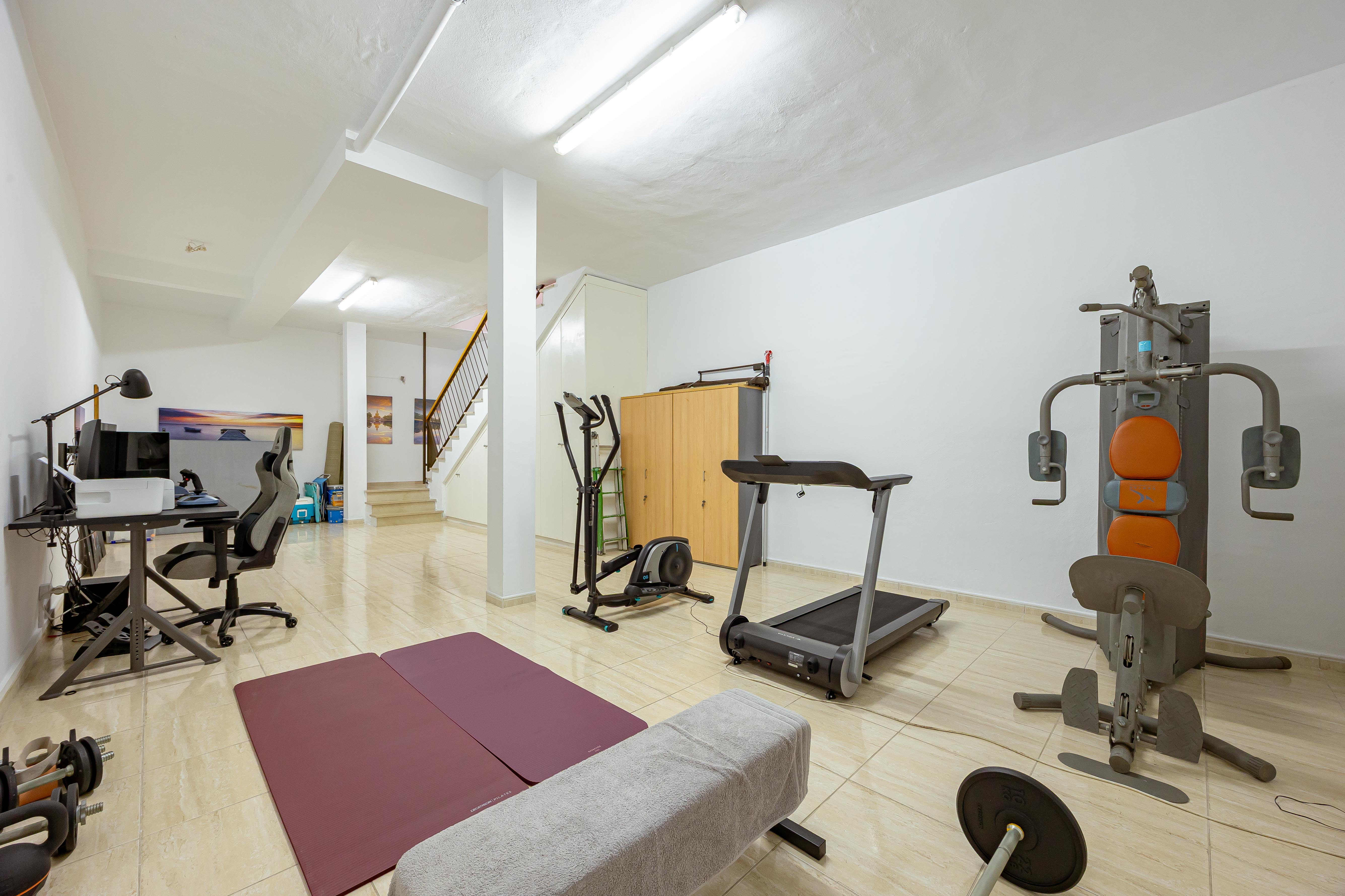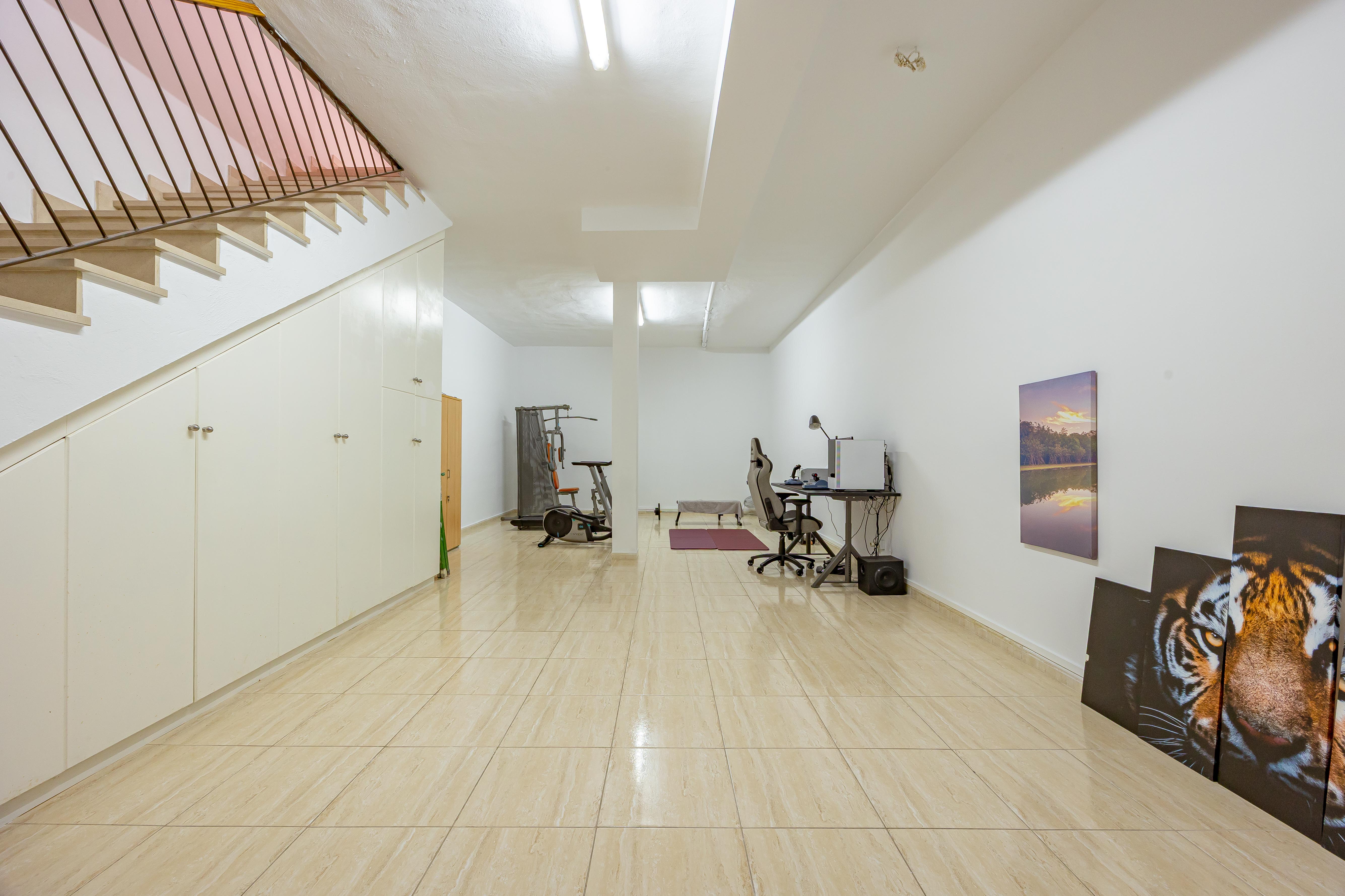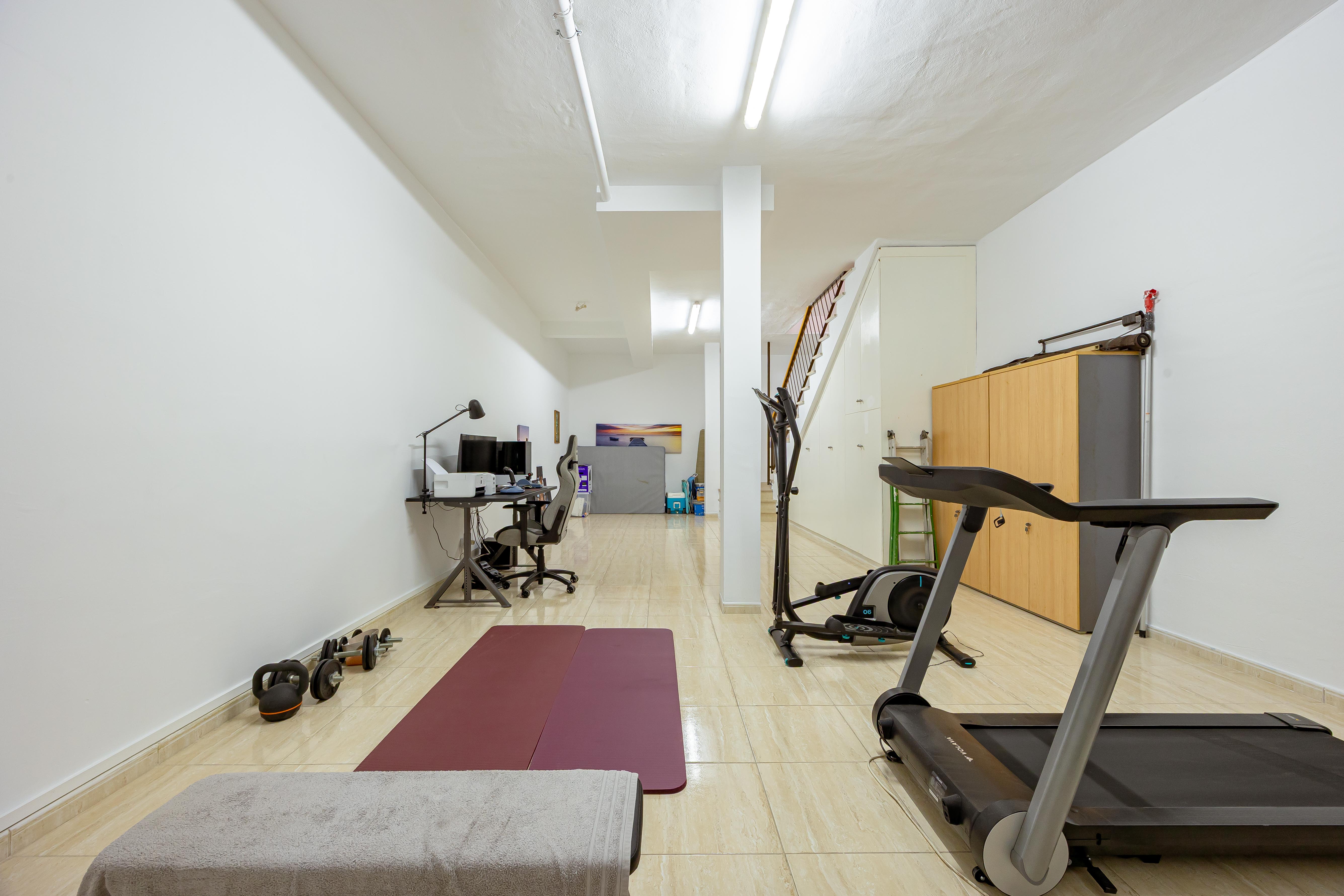 Planta sótano: amplio espacio polivalente actualmente destinado a gimnasio y oficina, ideal como zona de trabajo, estudio o área de ocio familiar.