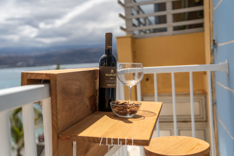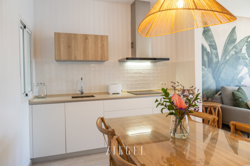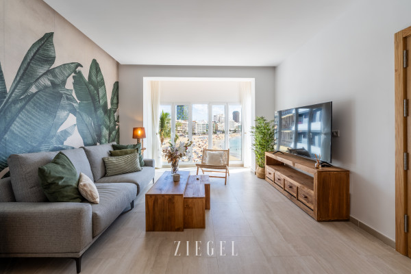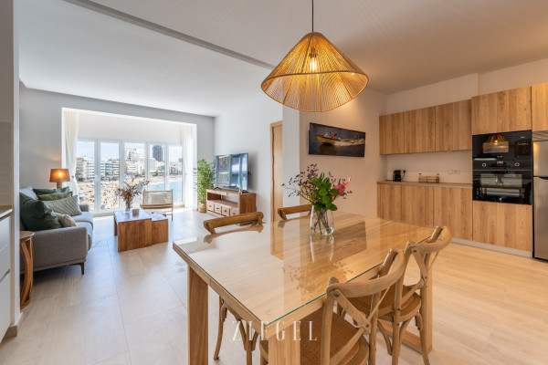 Vivienda con un gran salón–cocina muy luminoso, completamente equipado y amueblado con gusto, desde el que se disfruta de vistas increíbles al mar y a la playa, con acceso a un pequeño balcón ideal para relajarse.