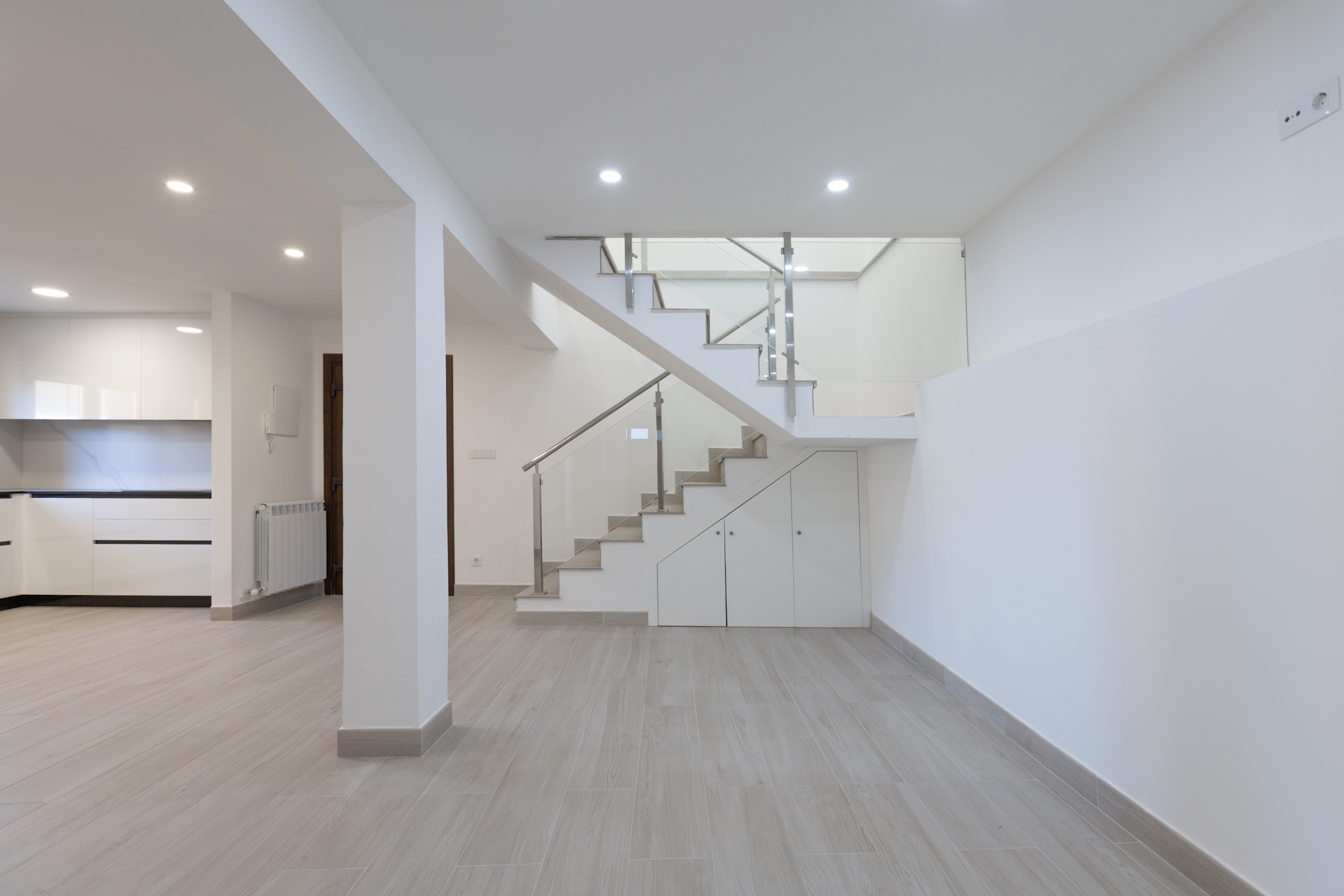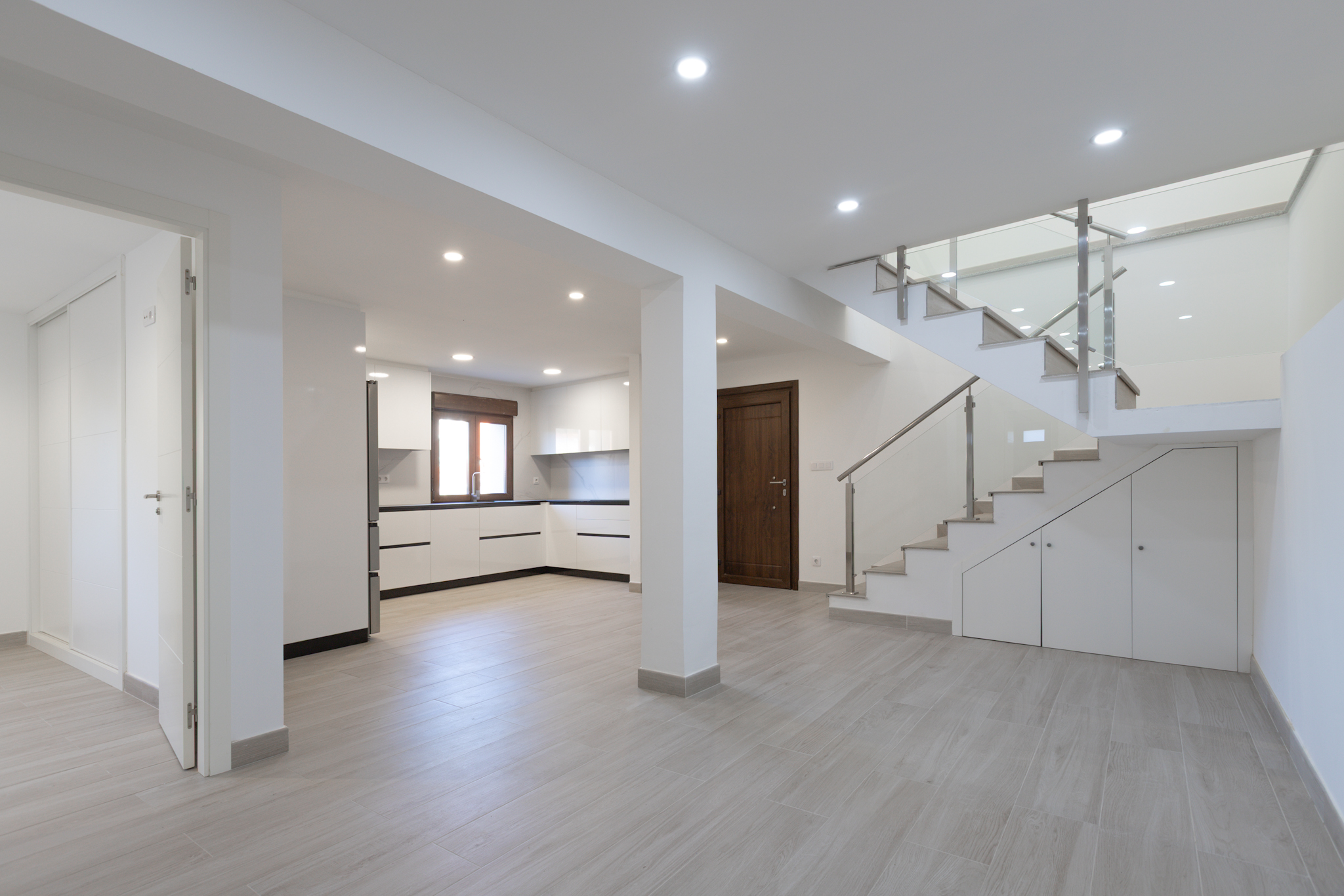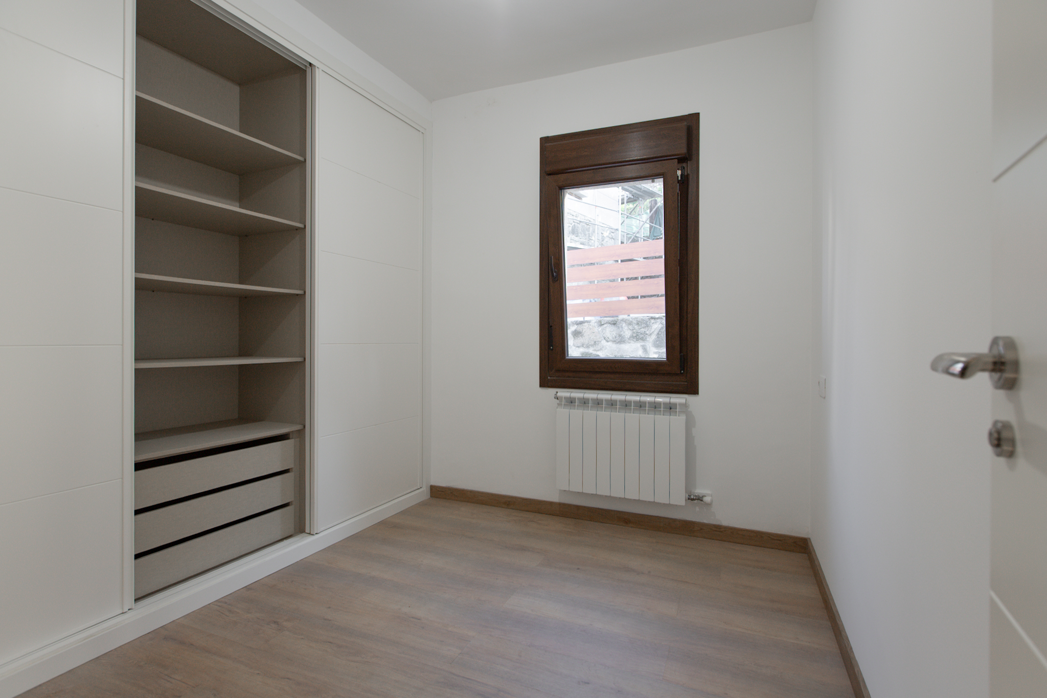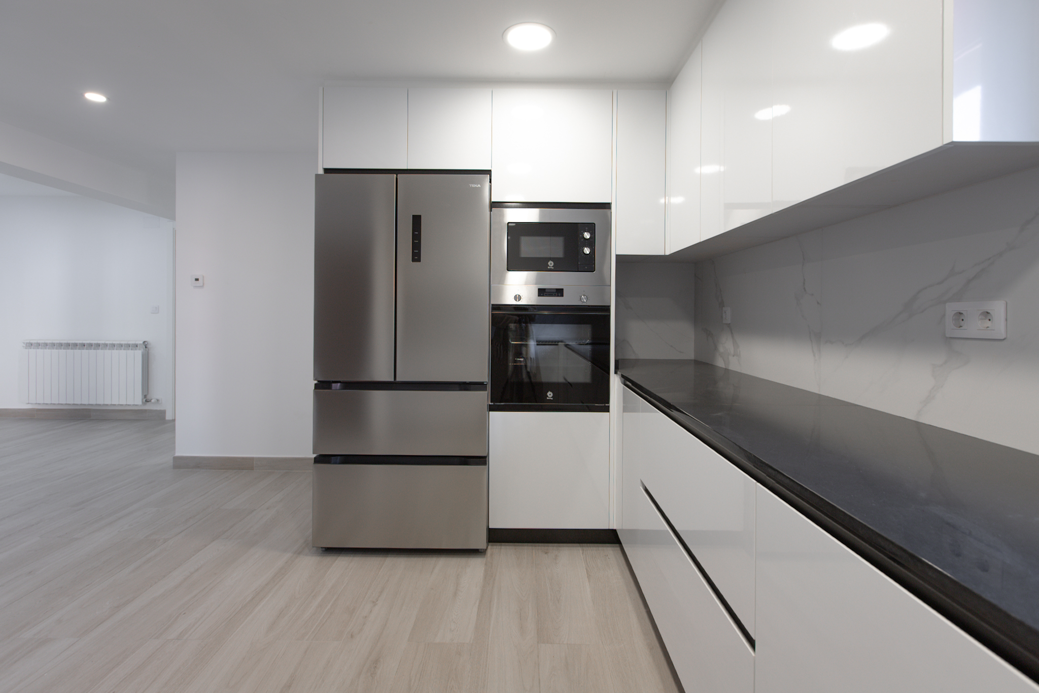 En la planta baja, destaca un salón con cocina totalmente equipada de concepto abierto, un dormitorio con armario empotrado, un baño completo y un práctico cuarto de lavandería con lavadora y zona de instalaciones. La cocina es de marca Santos con los electrodomésticos (nevera, horno, microondas, lavavajillas) a estrenar.