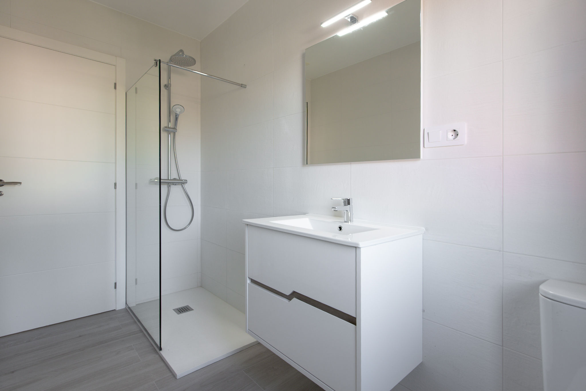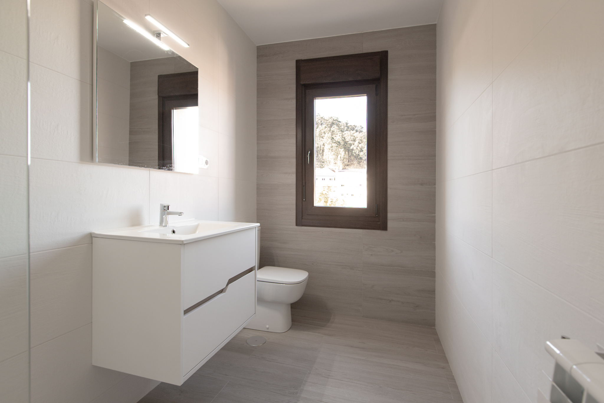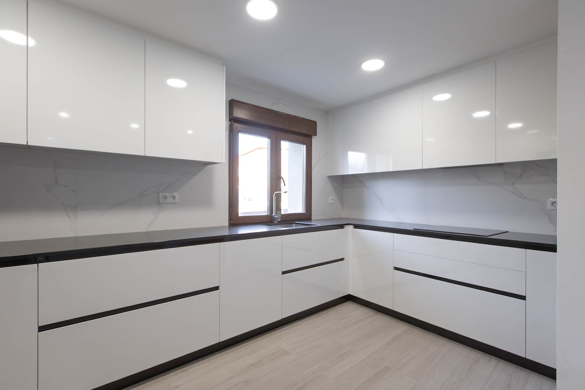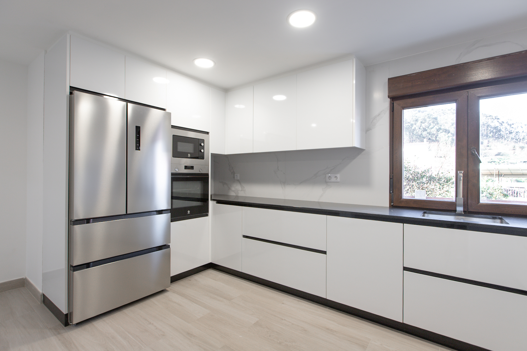 En la planta baja, destaca un salón con cocina totalmente equipada de concepto abierto, un dormitorio con armario empotrado, un baño completo y un práctico cuarto de lavandería con lavadora y zona de instalaciones. La cocina es de marca Santos con los electrodomésticos (nevera, horno, microondas, lavavajillas) a estrenar.