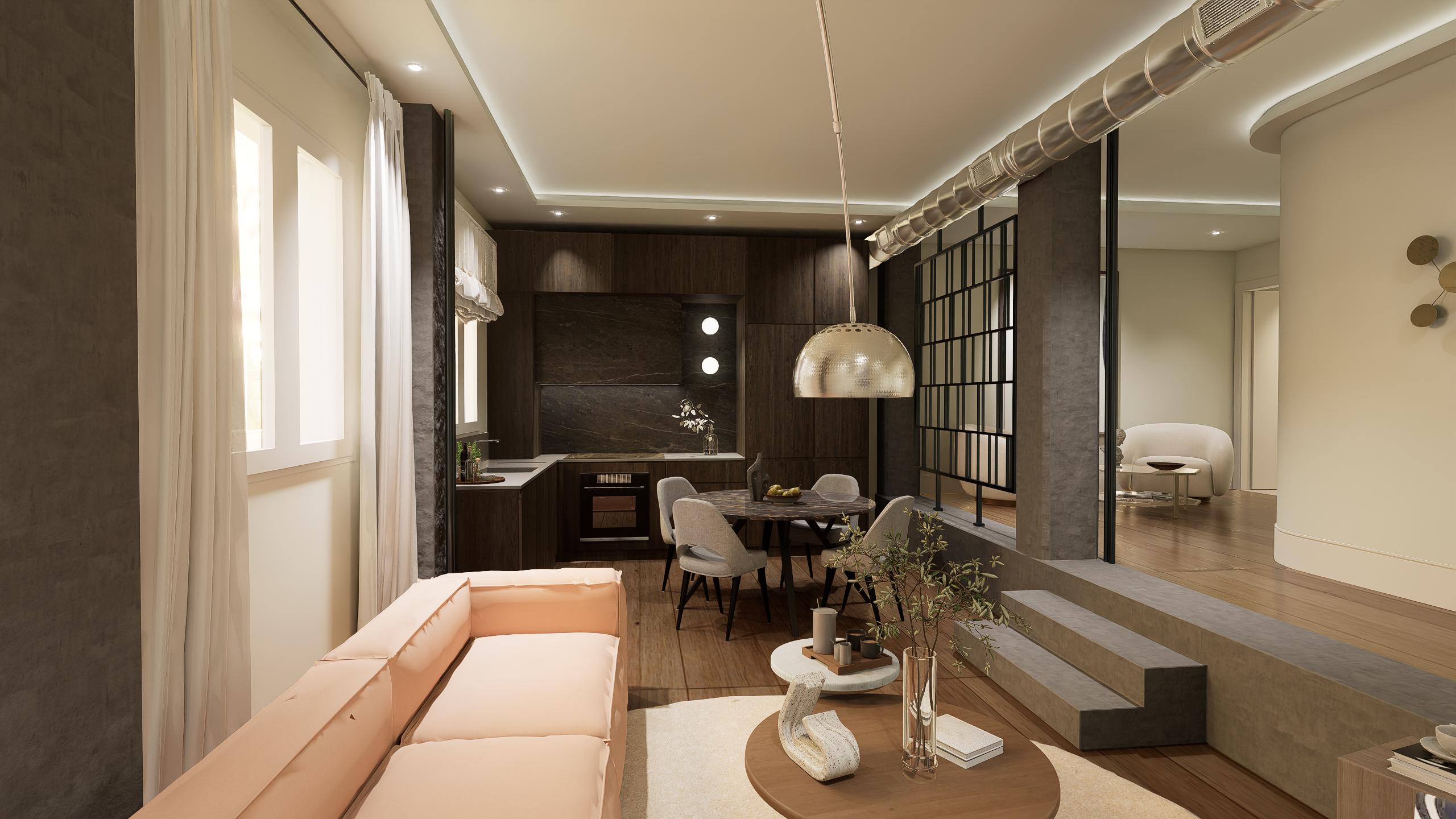 Al acceder, serás recibido por un espectacular salón de doble altura, enriquecido con techos altos que realzan la amplitud del espacio. La cocina integrada, con armarios de gran capacidad en madera y una elegante encimera de granito, cuenta con electrodomésticos modernos y grifería dorada, ofreciendo un entorno perfecto para crear momentos inolvidables.