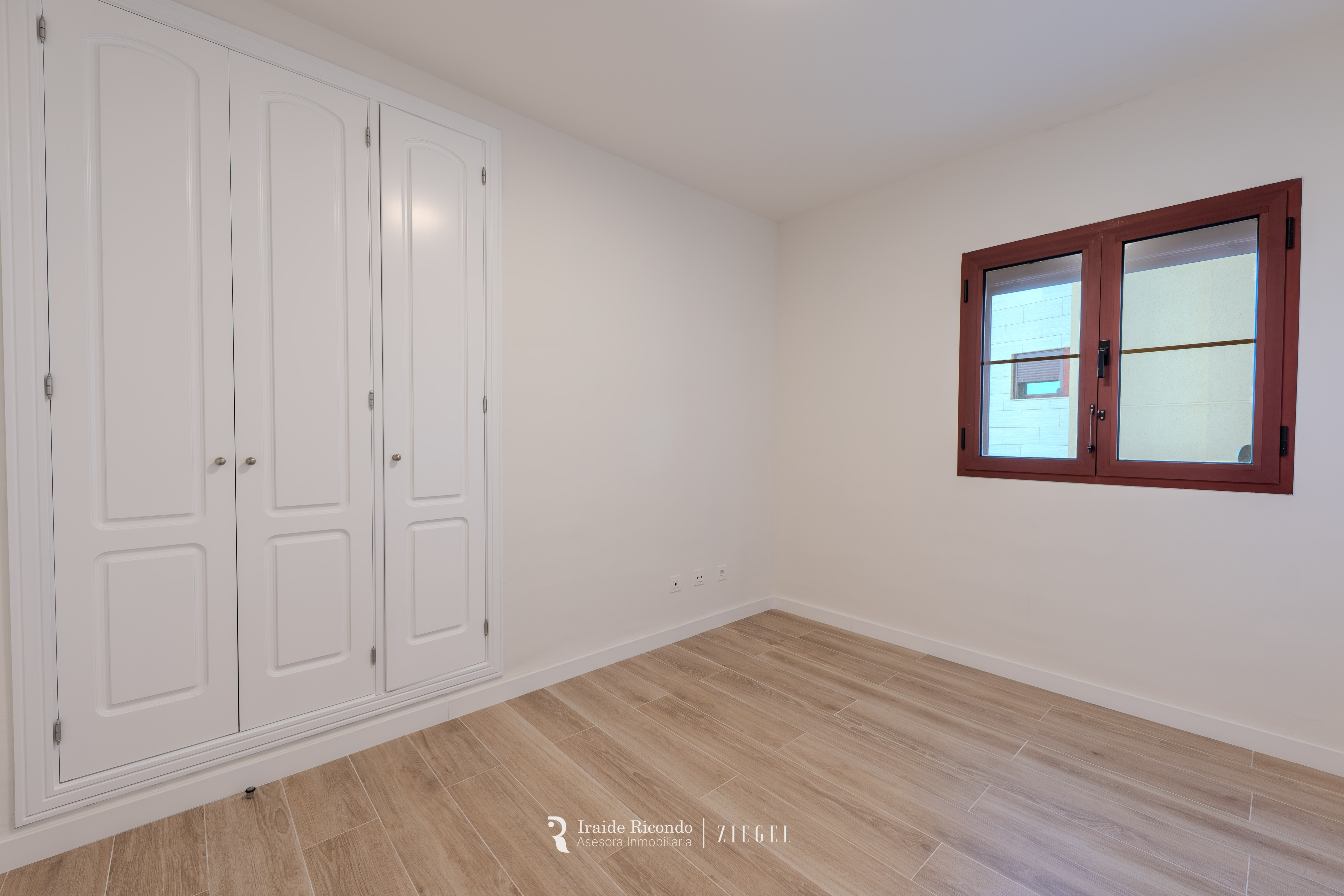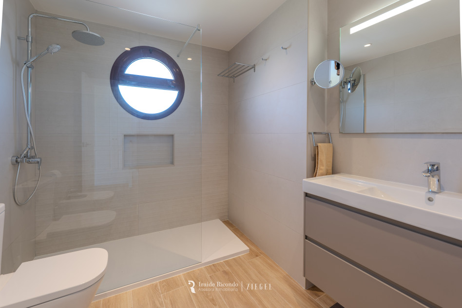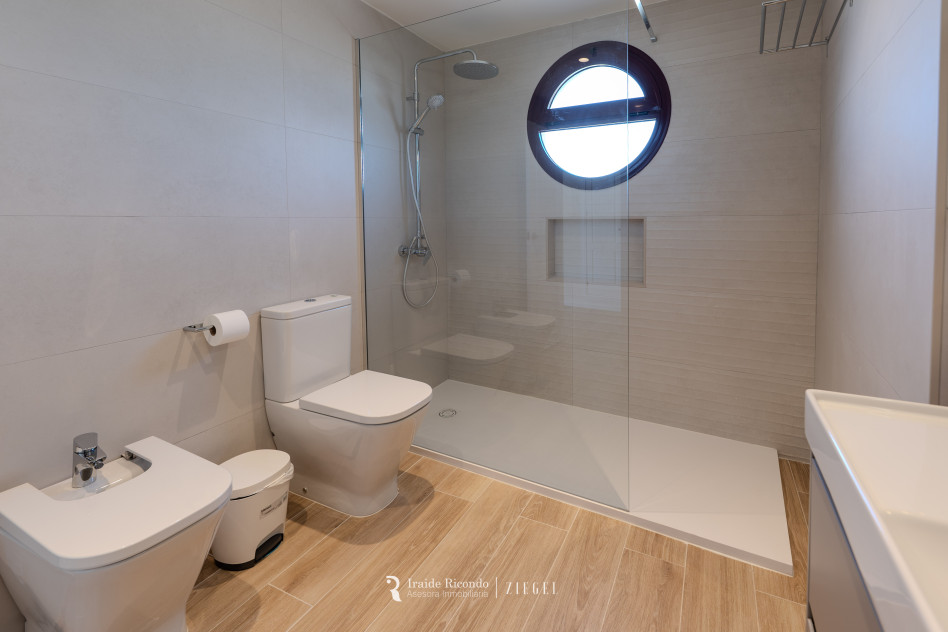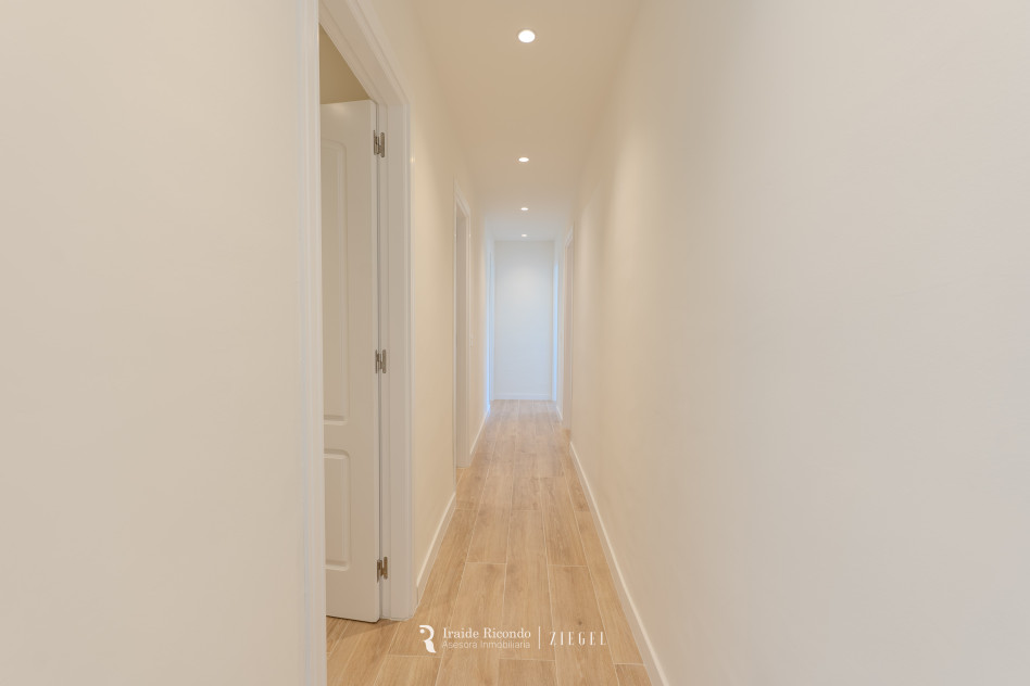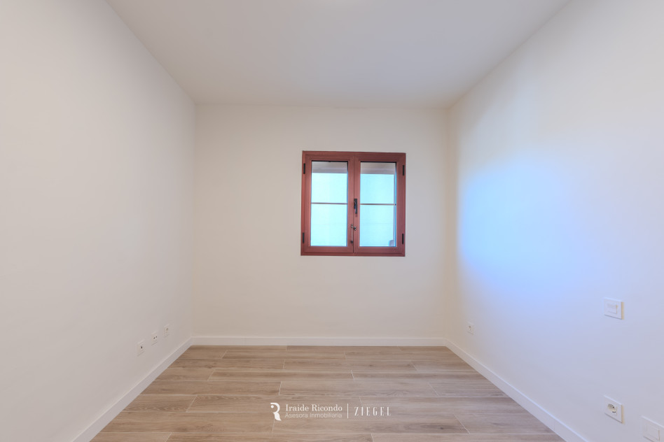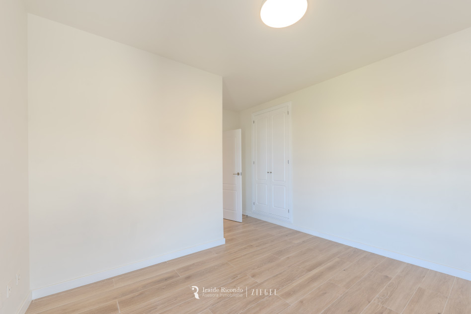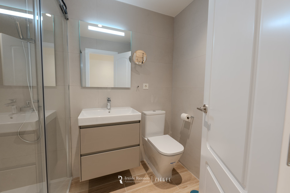 El inmueble cuenta con tres dormitorios, destacando una elegante suite principal con baño privado. Las otras dos habitaciones, igualmente amplias, disponen de armarios empotrados y comparten un segundo baño completo.