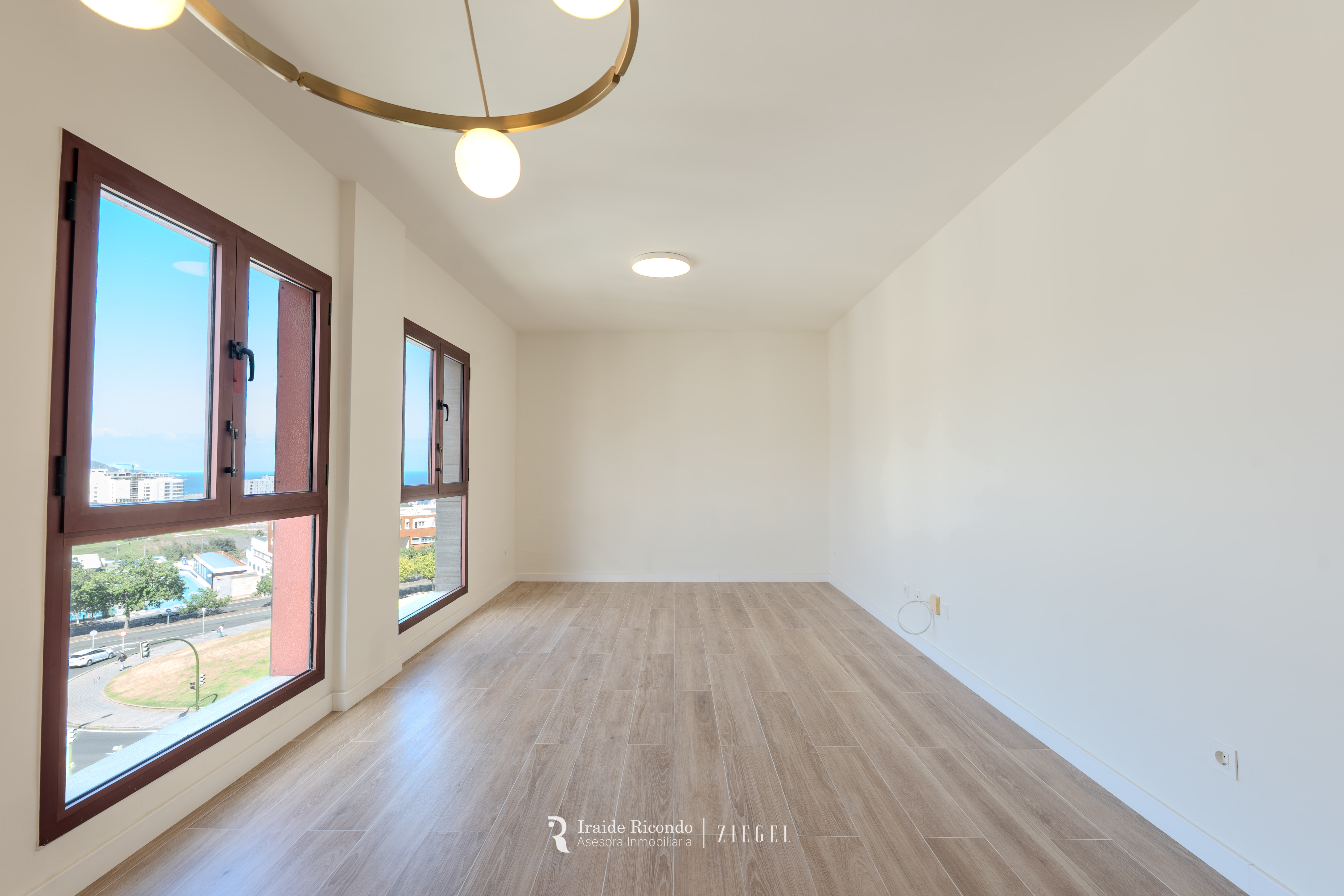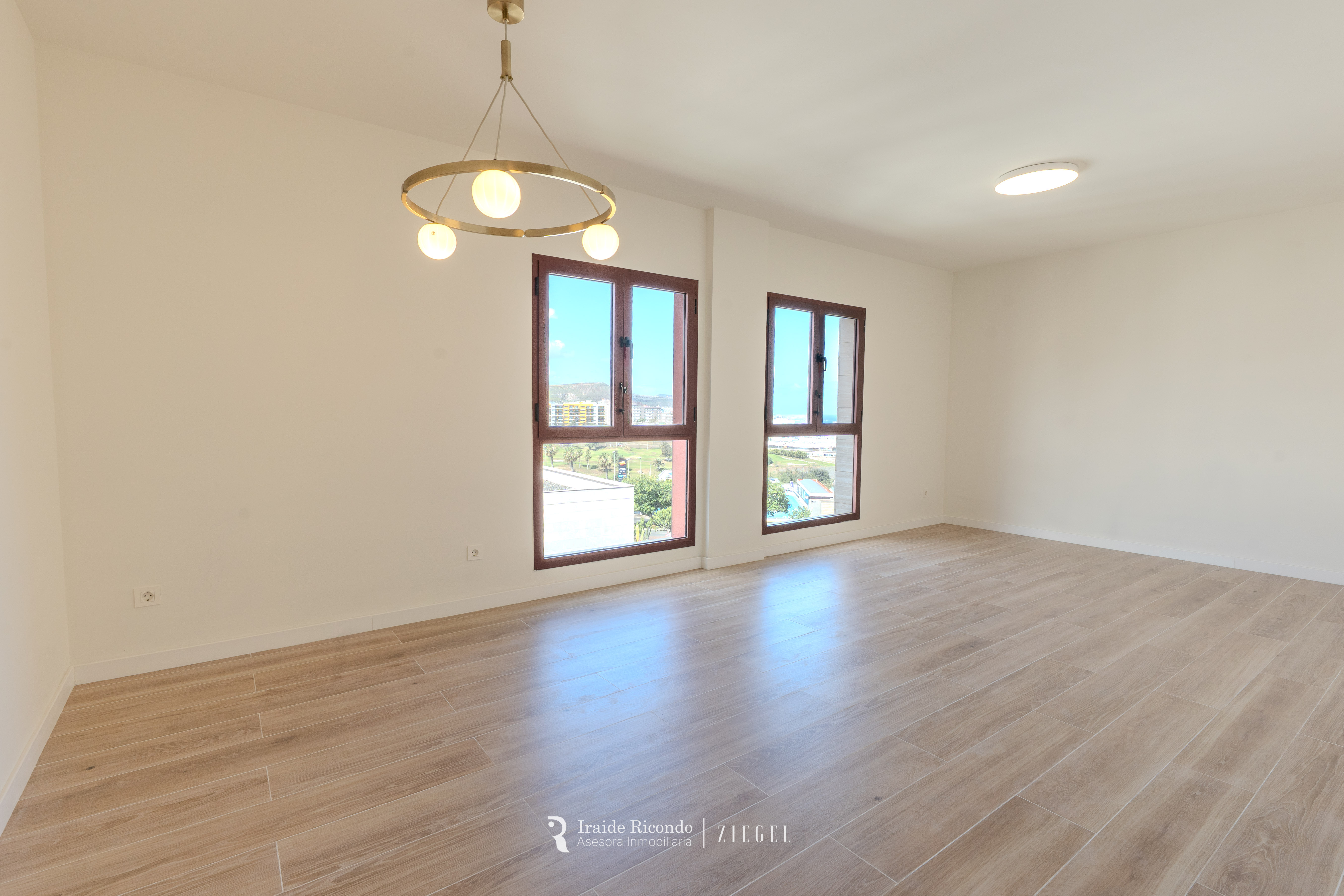 La cocina, moderna y totalmente equipada, se complementa con una práctica zona de despensa con lavadora y secadora. El amplio salón, lleno de luz gracias a sus grandes ventanales, permite crear distintos ambientes y disfrutar de unas vistas privilegiadas al campo de golf, al Auditorio y al mar.
