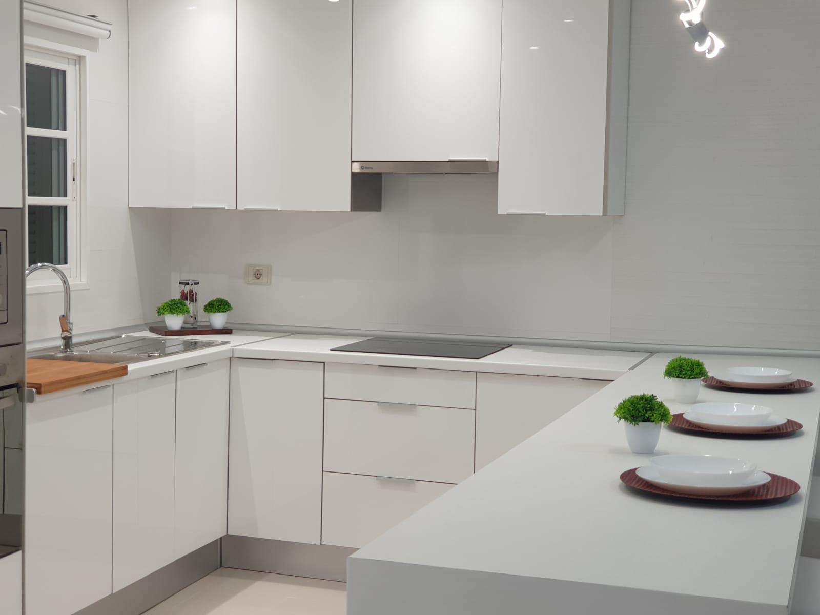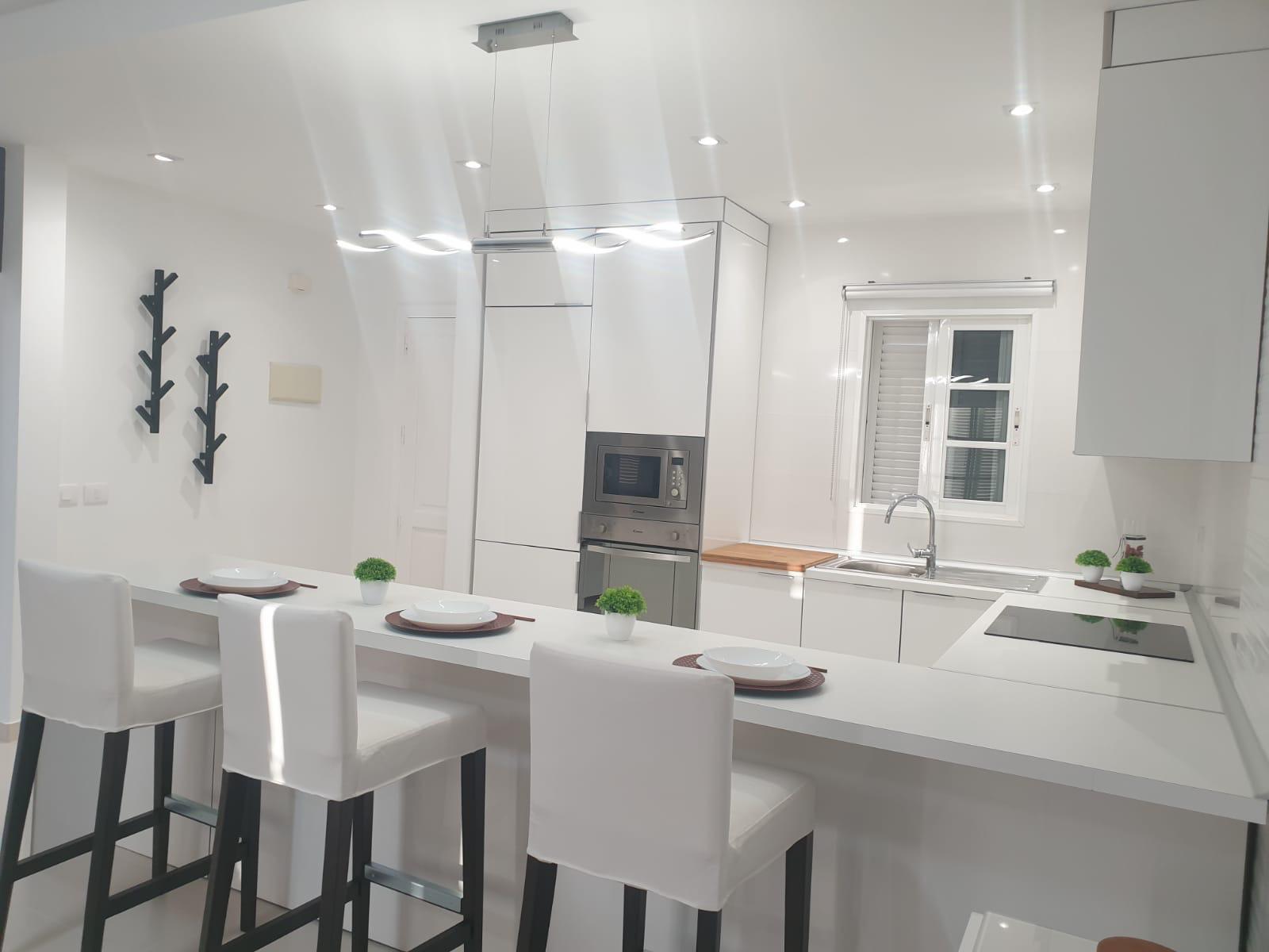 Salón acogedor, equipado con sofá y TV, se integra perfectamente con la cocina totalmente equipada, creando un ambiente funcional y agradable.