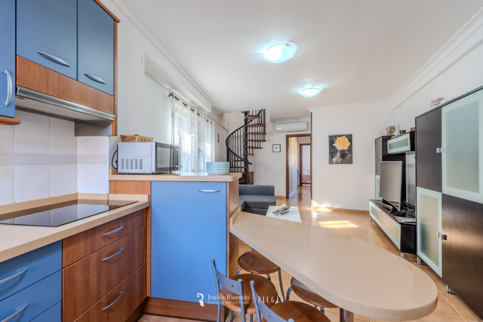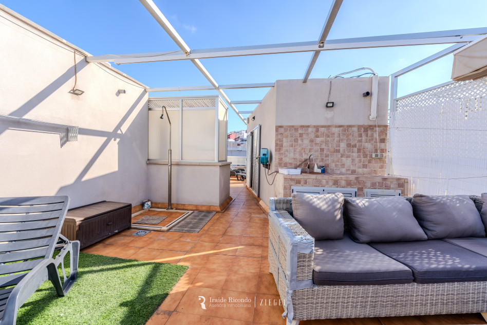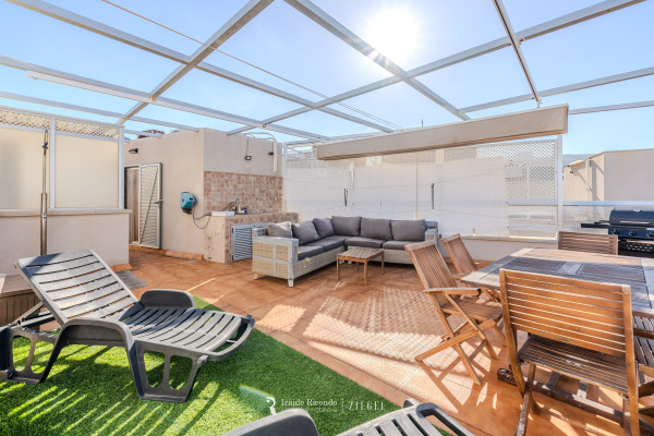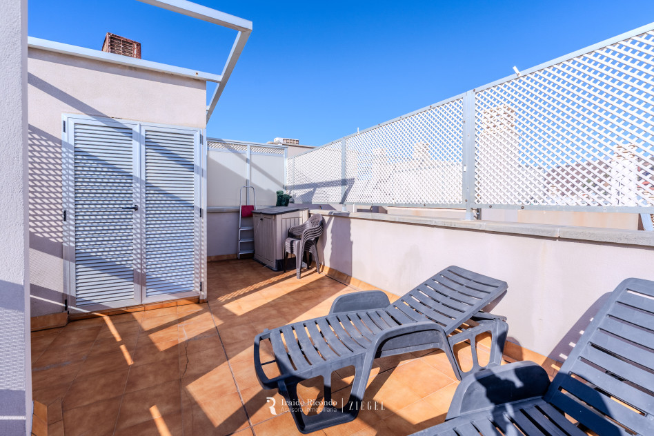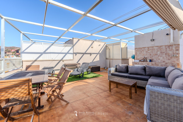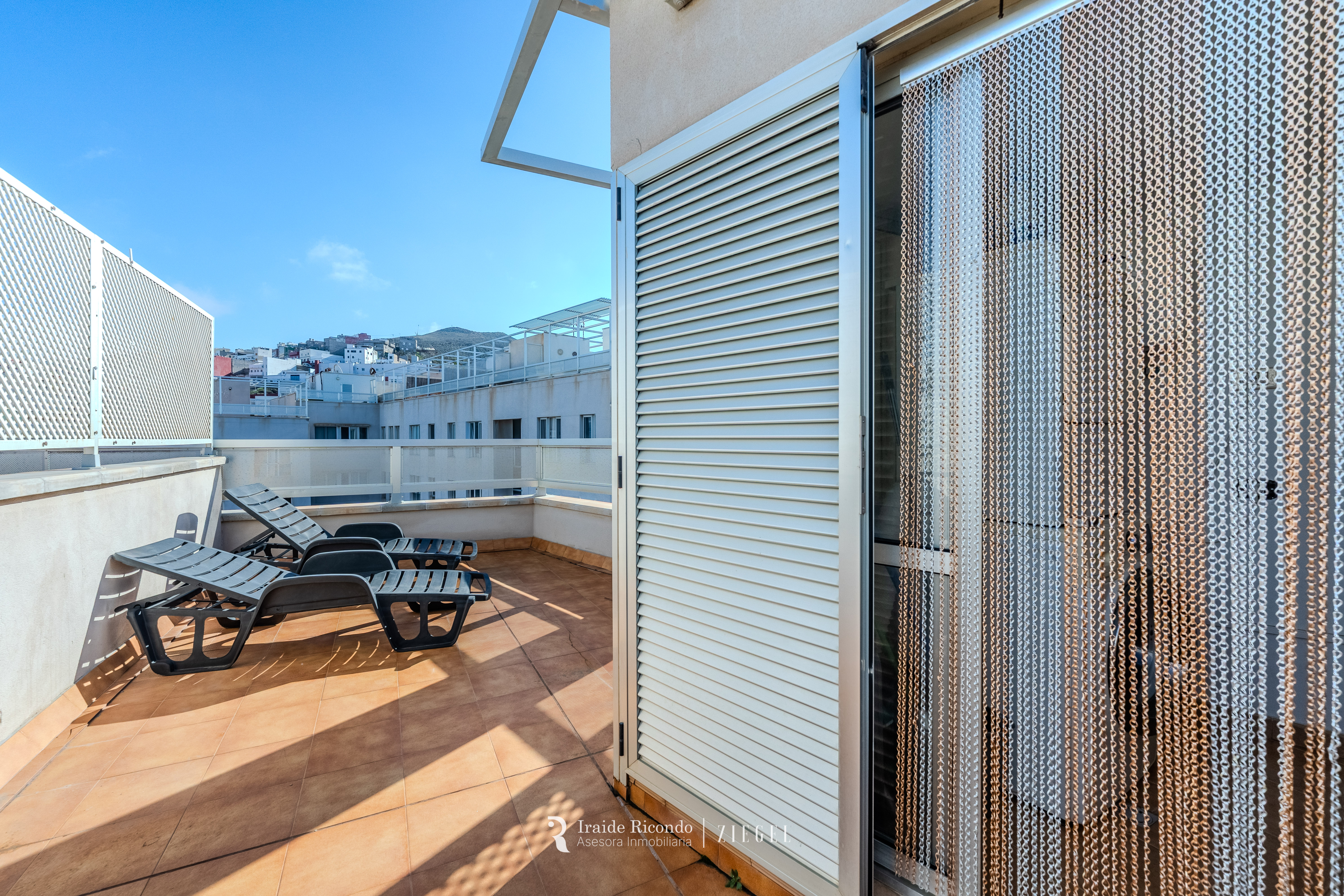 Desde el salón, una escalera de caracol conduce a la planta superior, donde se encuentra una práctica zona destinada a lavandería (lavadora y secadora) y el verdadero valor diferencial de la propiedad: una espectacular terraza privativa descubierta de aproximadamente 60 m² con vistas despejadas al mar. Este espacio permite crear distintos ambientes perfectamente definidos, como zona de barbacoa, comedor exterior y área de solárium, ideal para disfrutar del clima privilegiado de la zona durante todo el año.