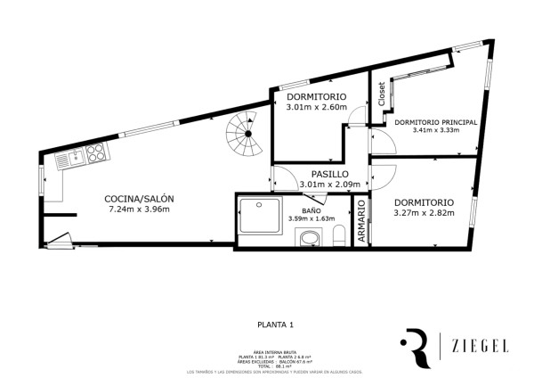 La vivienda se distribuye en una tercera planta con ascensor y destaca por su luminosidad. Presenta un moderno espacio diáfano de salón–cocina en concepto abierto, diseñado para maximizar la amplitud y la entrada de luz natural.