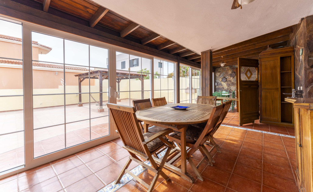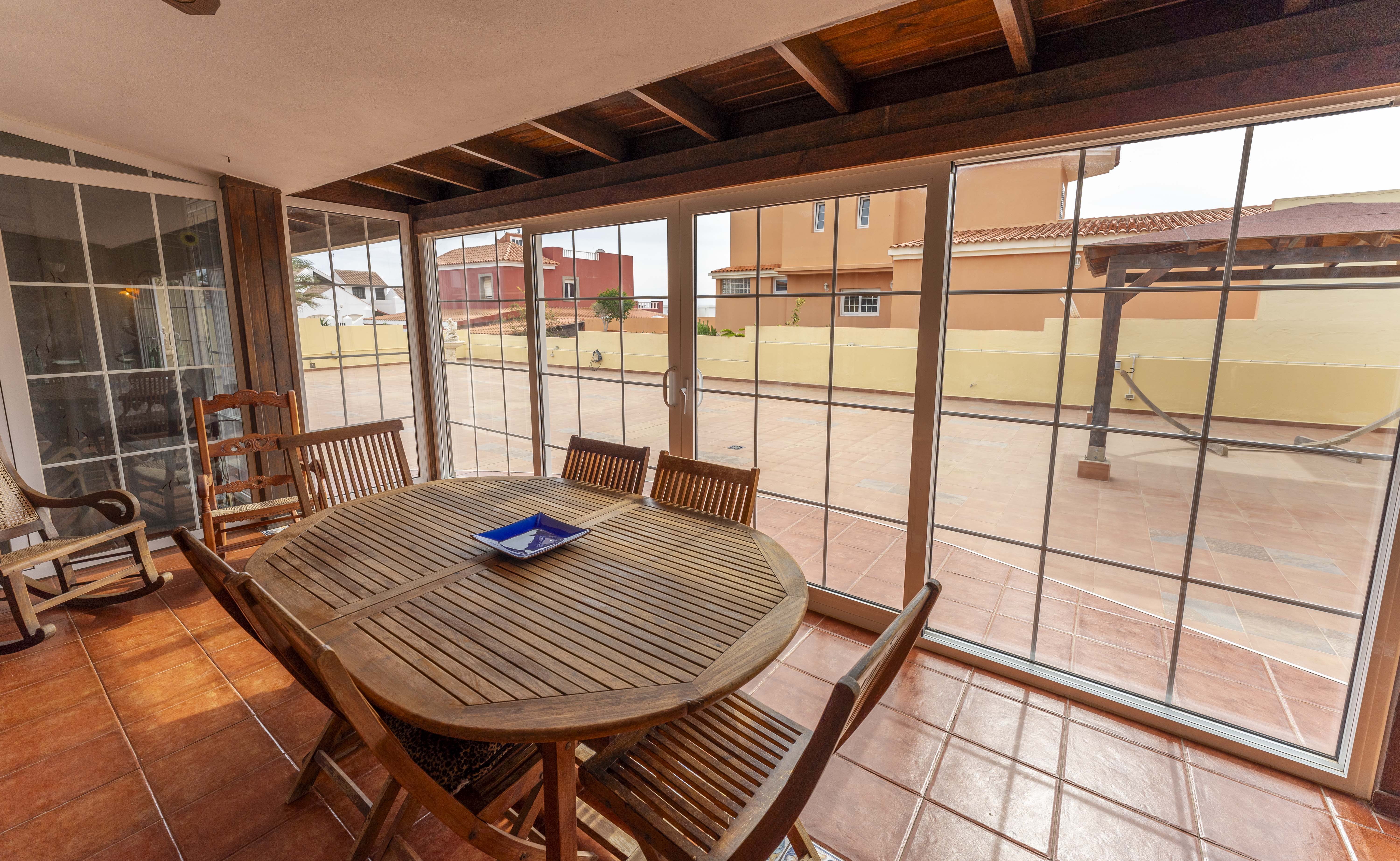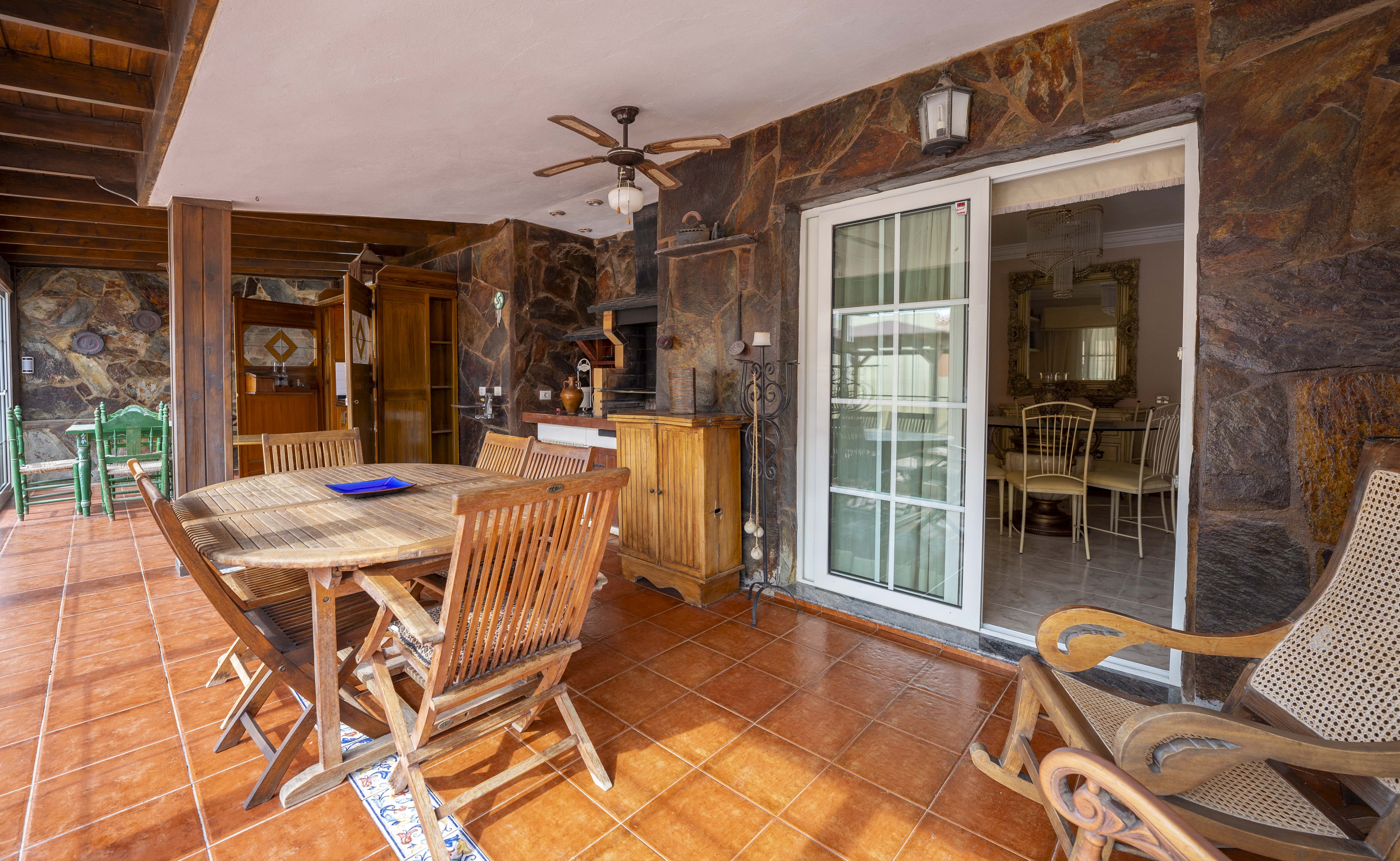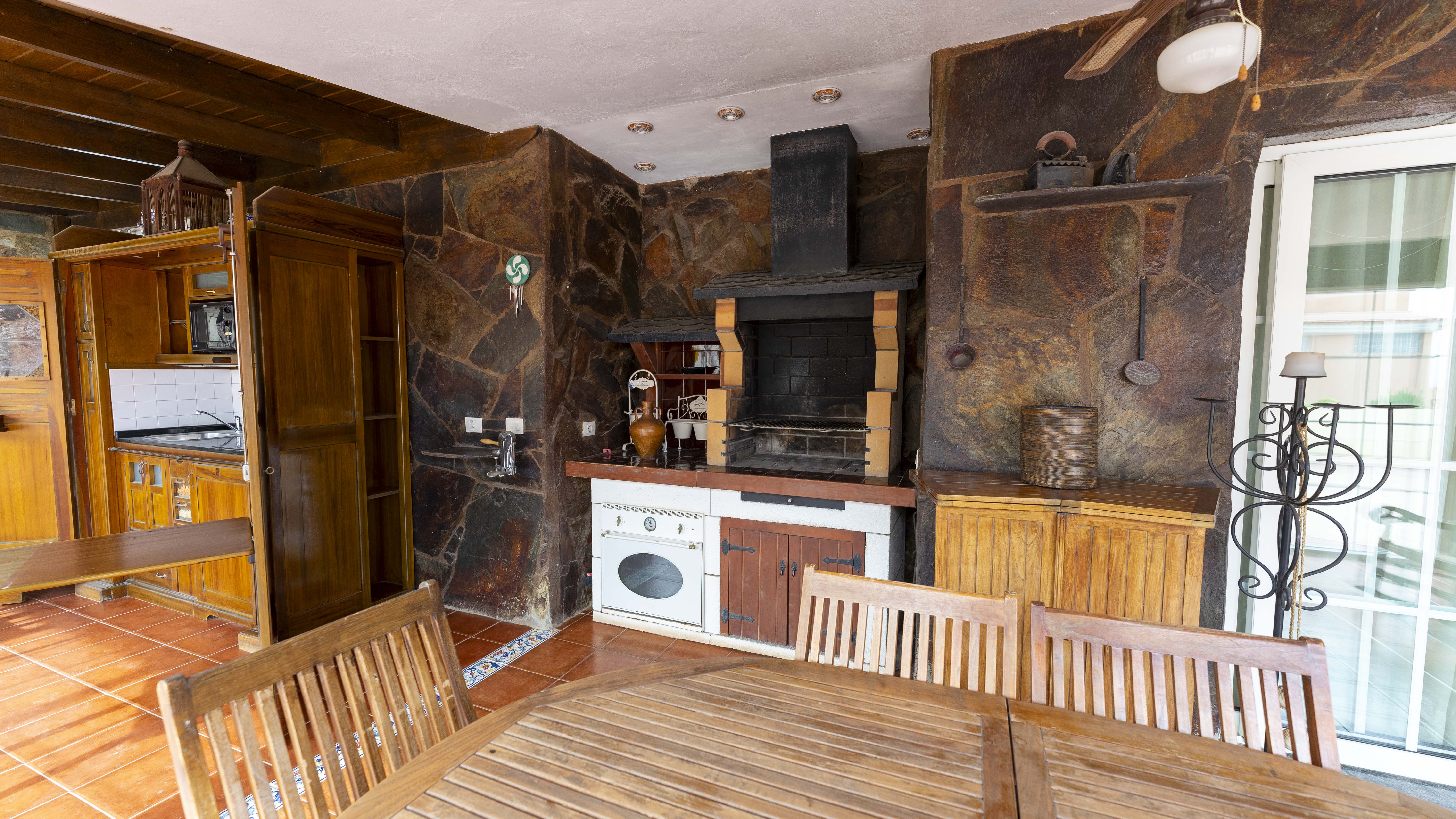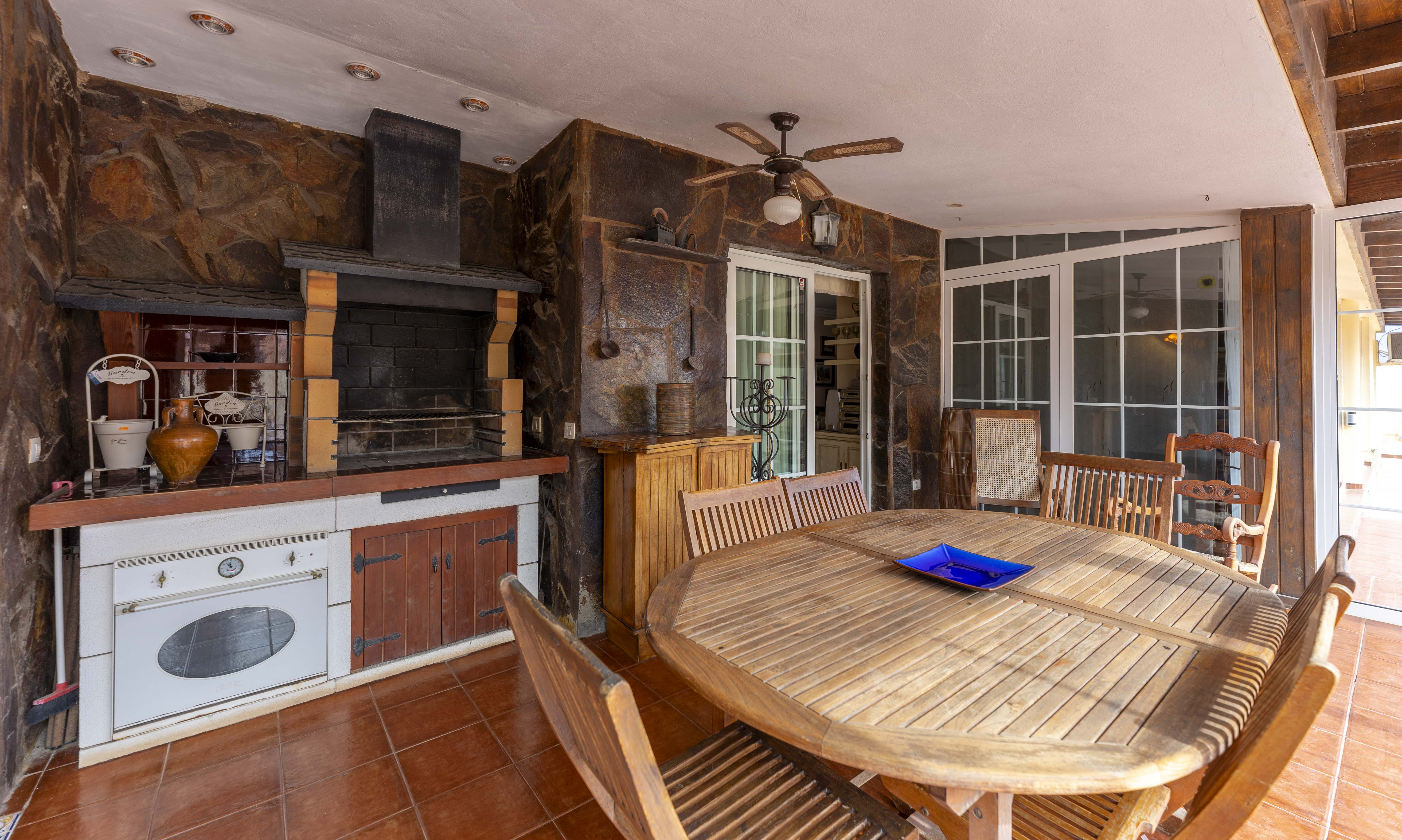 Un gran porche con barbacoa, cocina y comedor cerrado con un gran ventanal que da a la terraza, el lugar ideal para disfrutar de la mejor compañía.