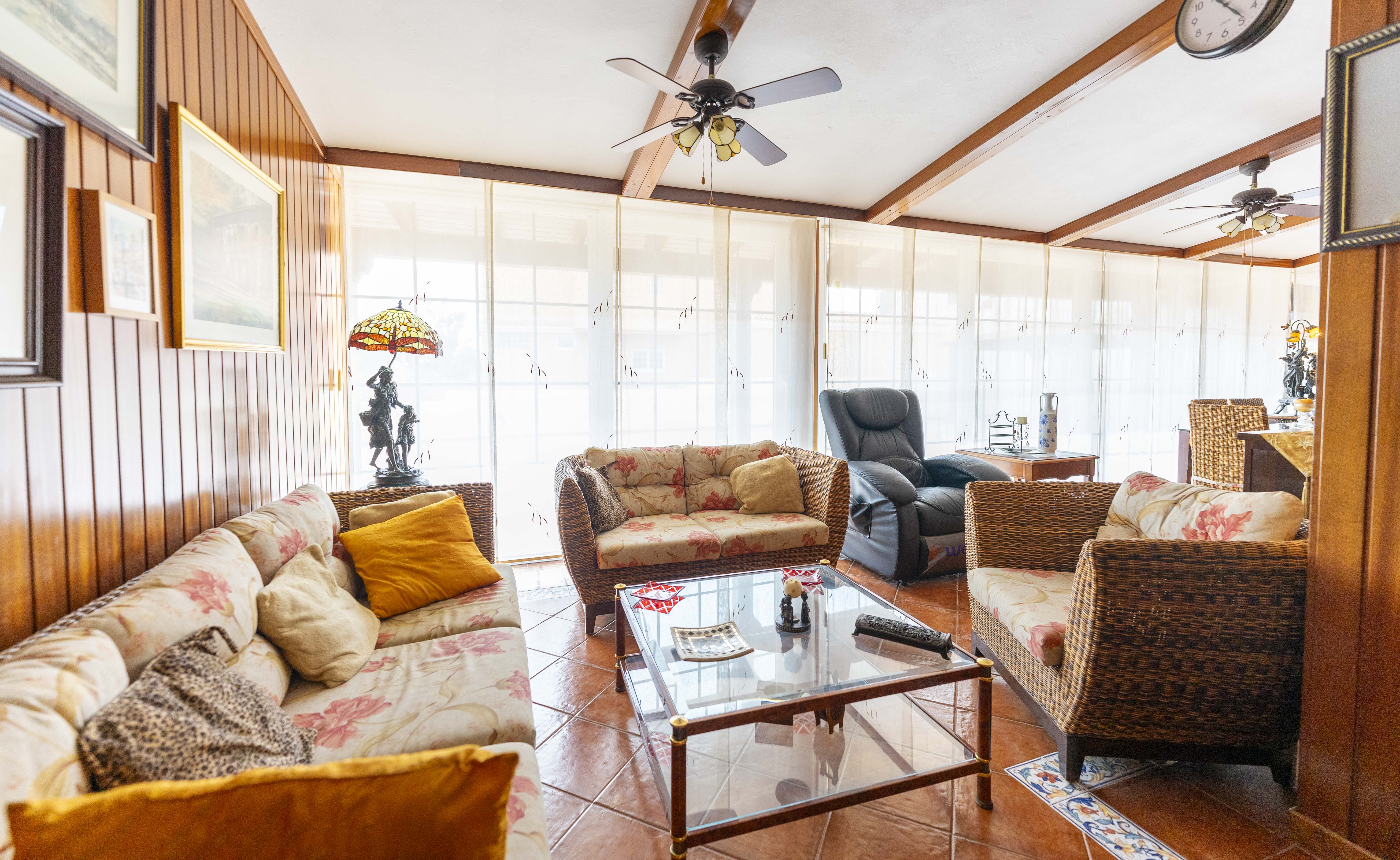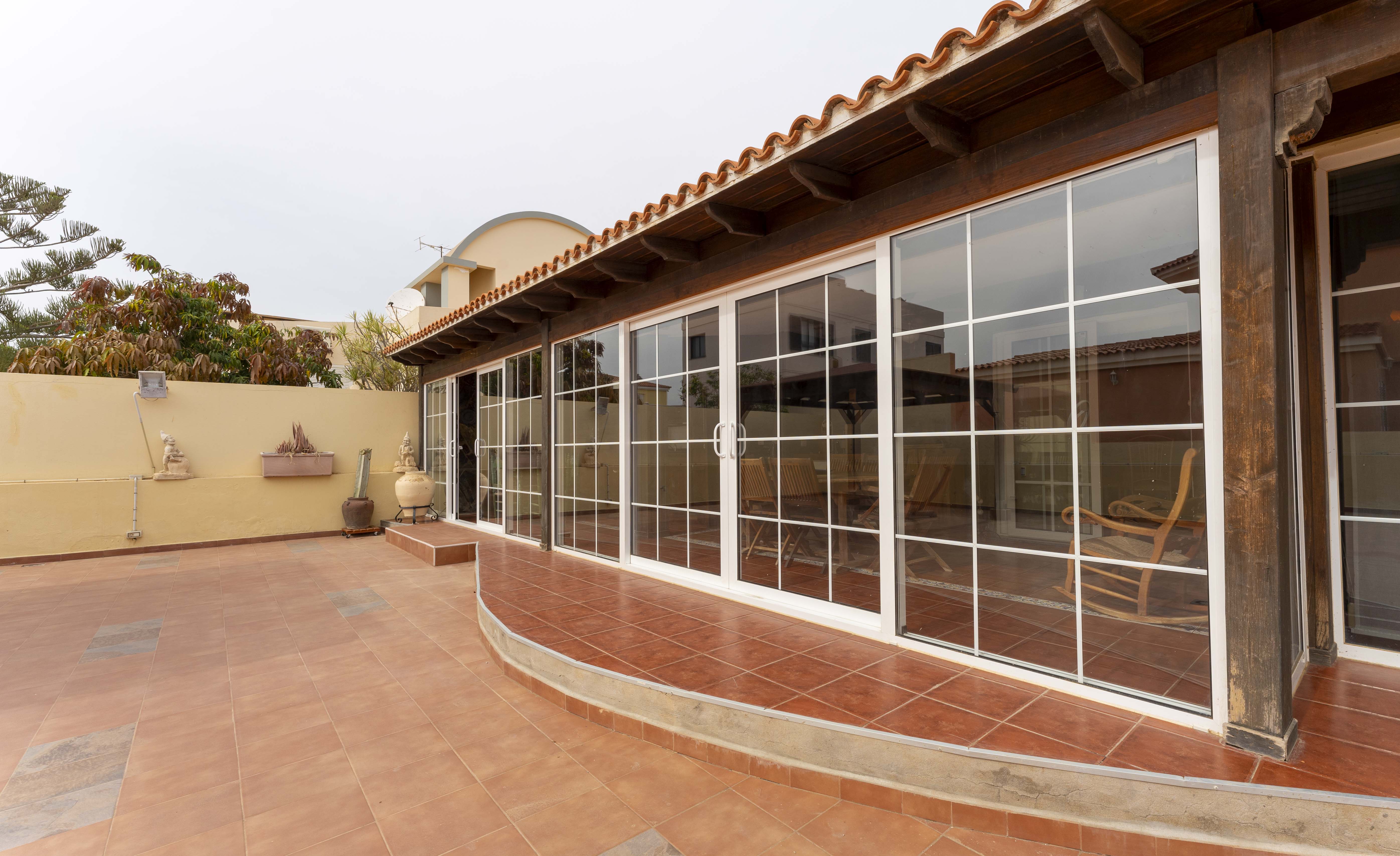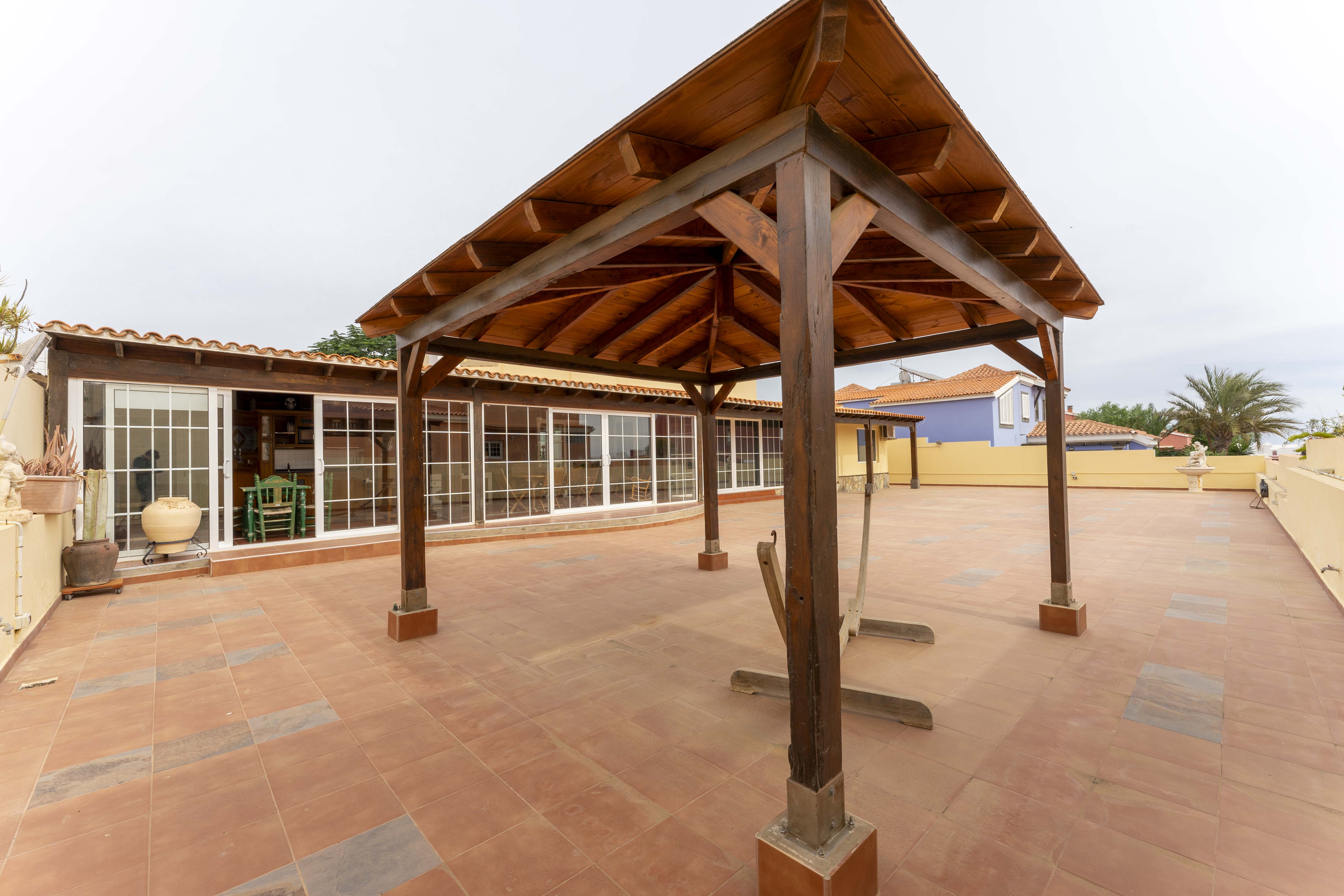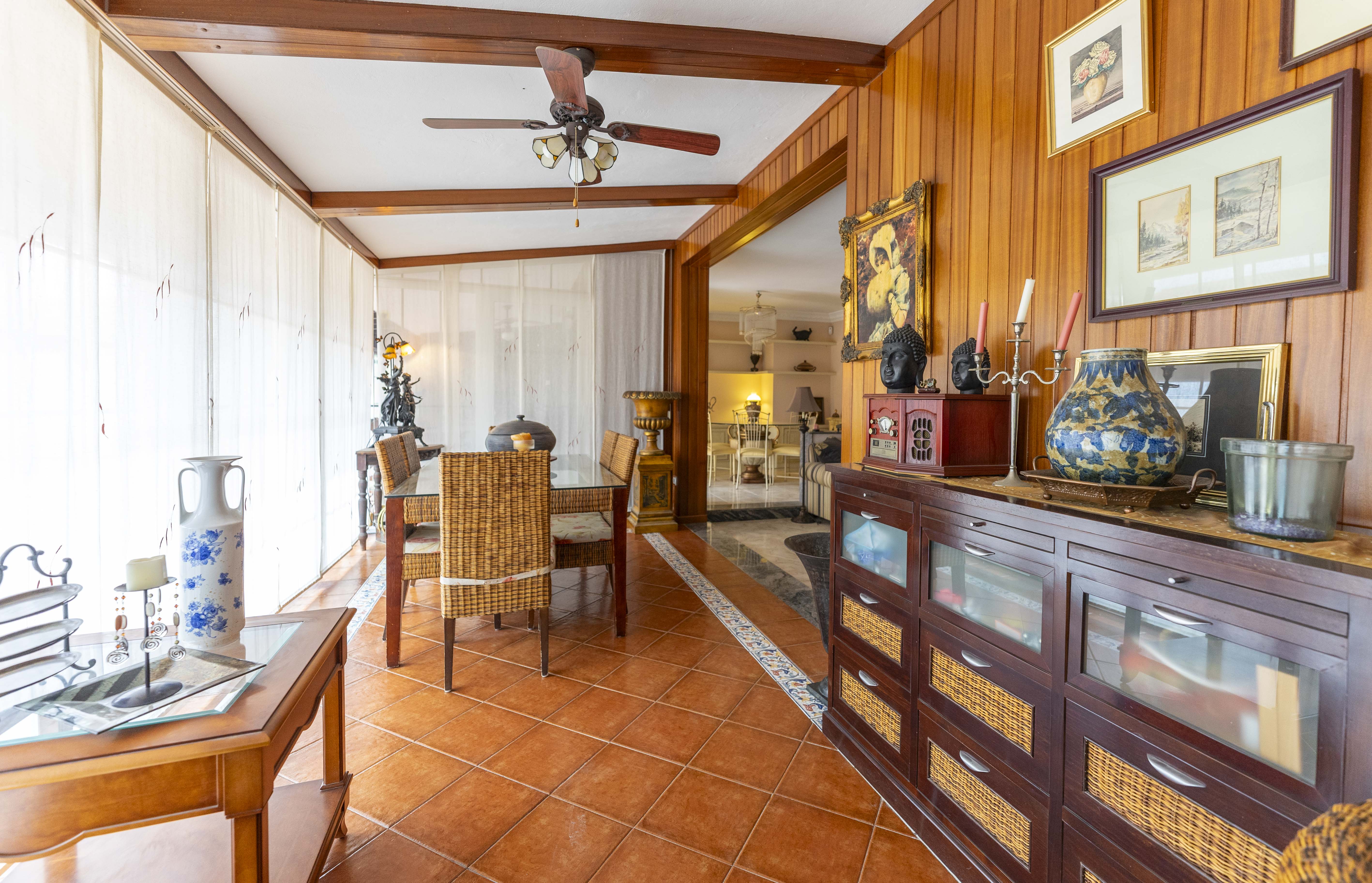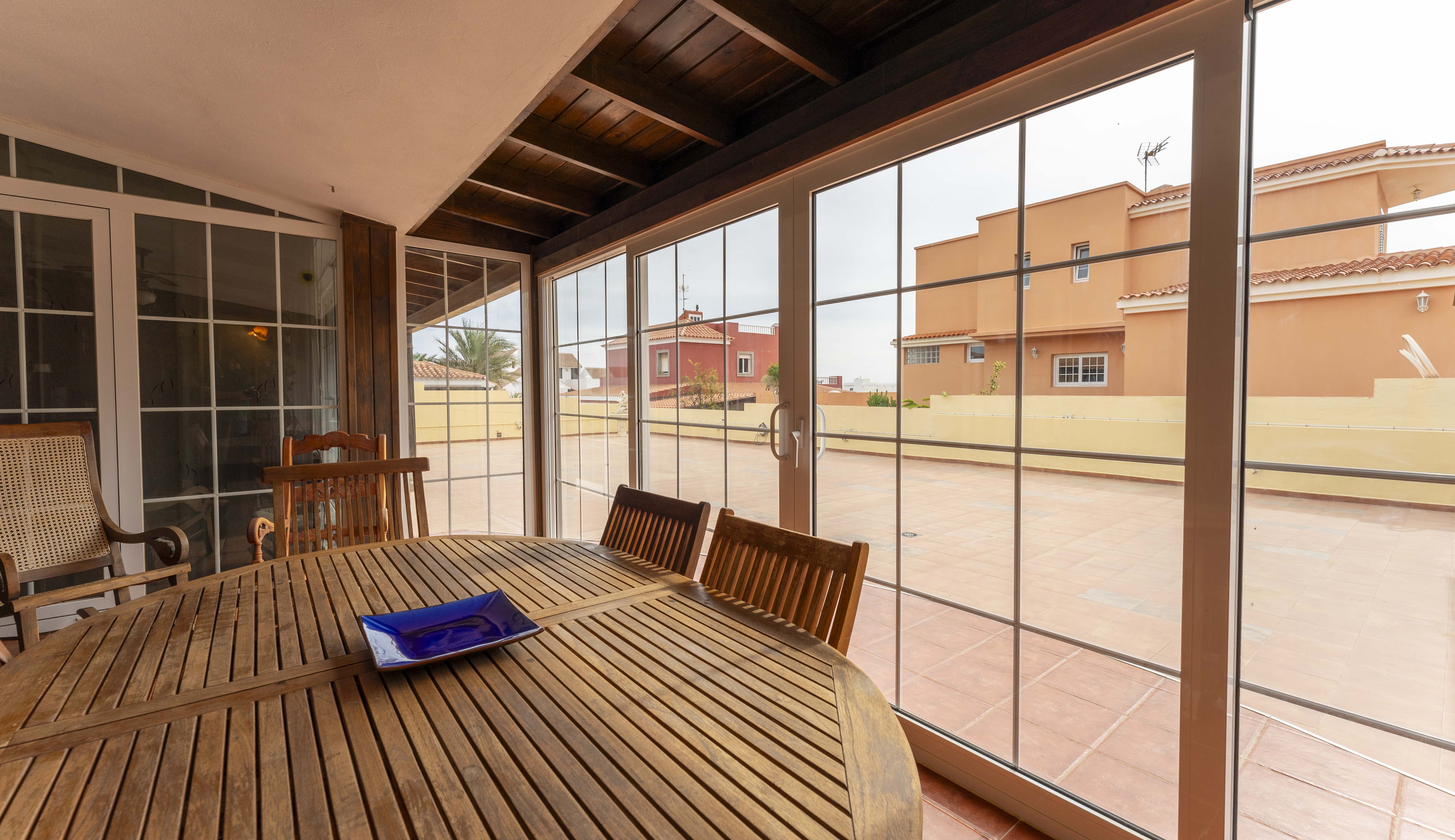 Un gran porche con barbacoa, cocina y comedor cerrado con un gran ventanal que da a la terraza, el lugar ideal para disfrutar de la mejor compañía.