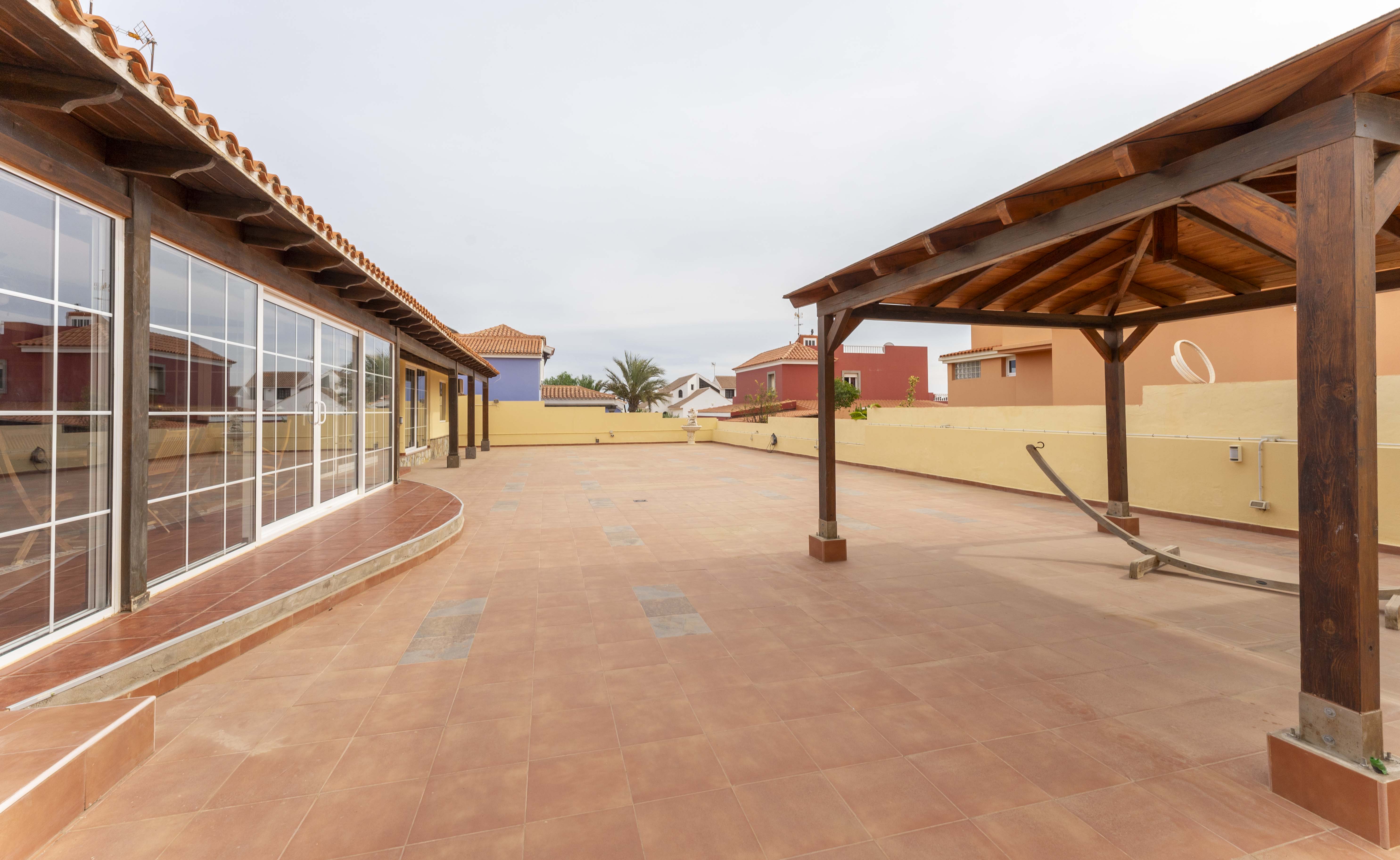 Tenemos una grandísima terraza orientada al sur de 220m2 con infinitas posibilidades, más una terraza pasillo lateral de 23m2 y la terraza frontal de la entrada con jardines.